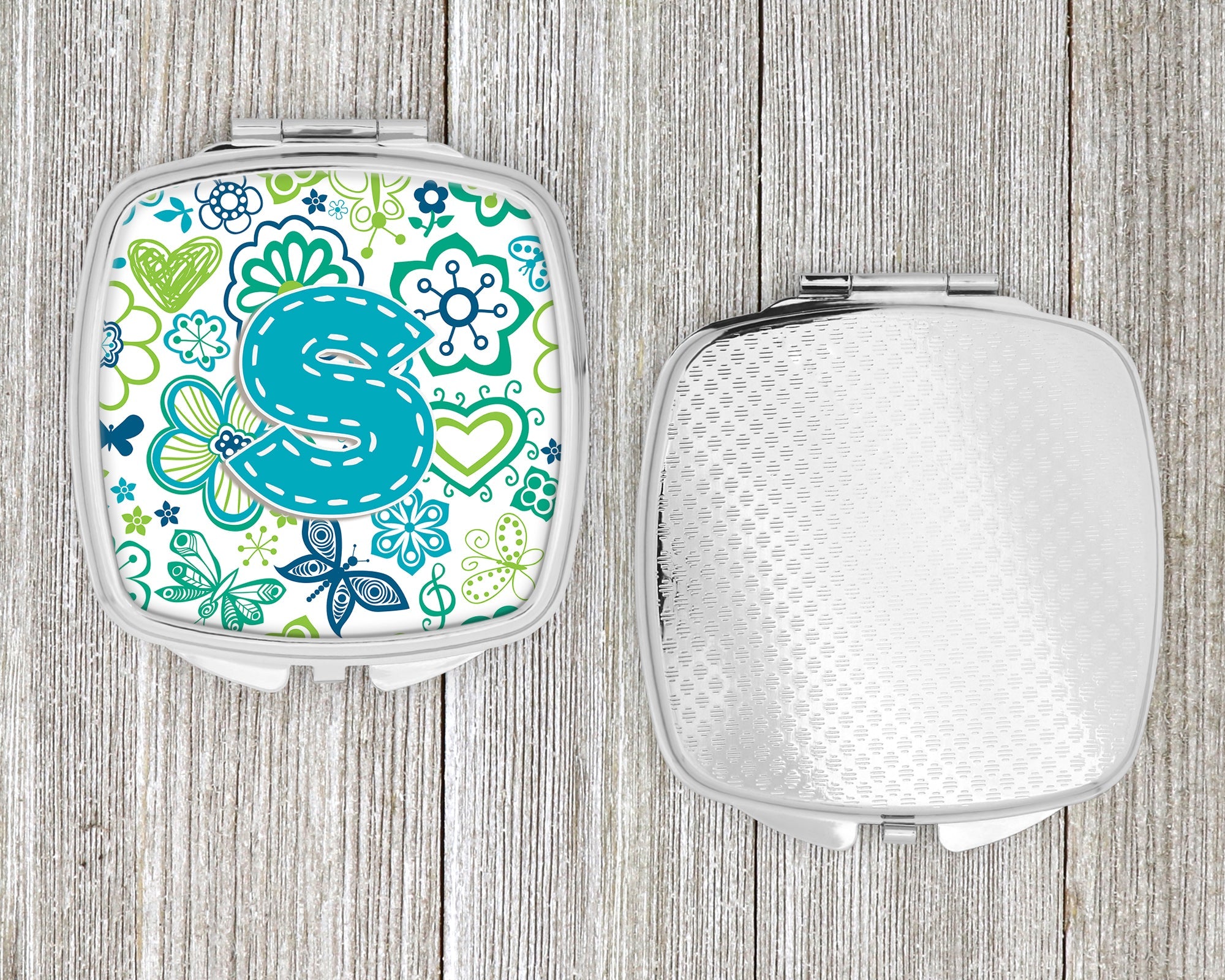 Letter S Flowers and Butterflies Teal Blue Compact Mirror – Stylish Purse Mirror with Artistic Covers CJ2006-SSCM