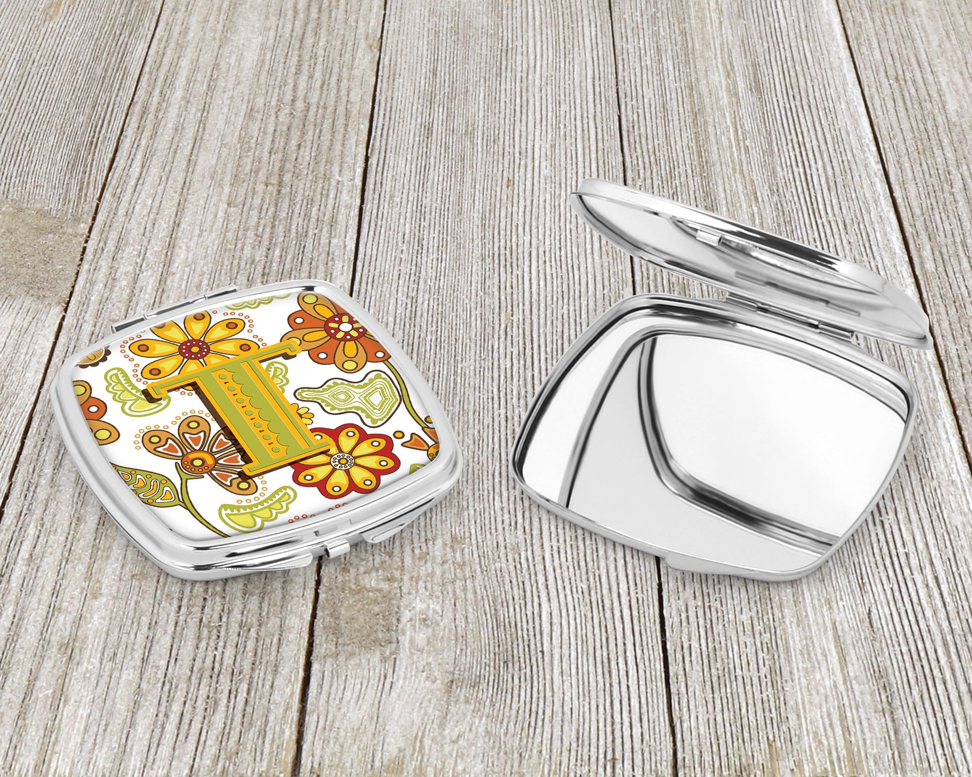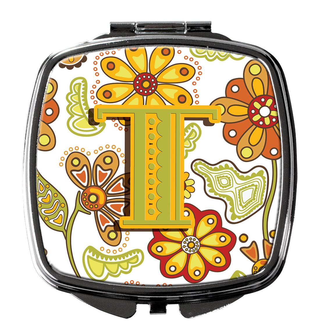 Letter T Floral Mustard and Green Compact Mirror – Stylish Purse Mirror with Artistic Covers CJ2003-TSCM