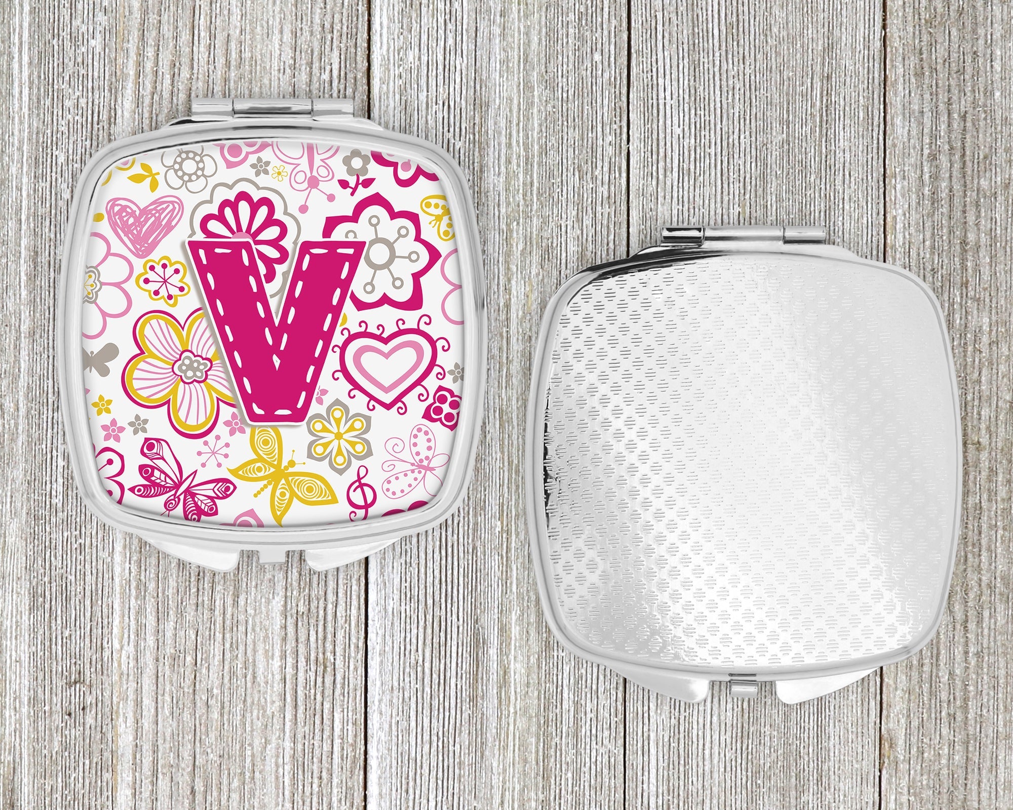 Letter V Flowers and Butterflies Pink Compact Mirror – Stylish Purse Mirror with Artistic Covers CJ2005-VSCM