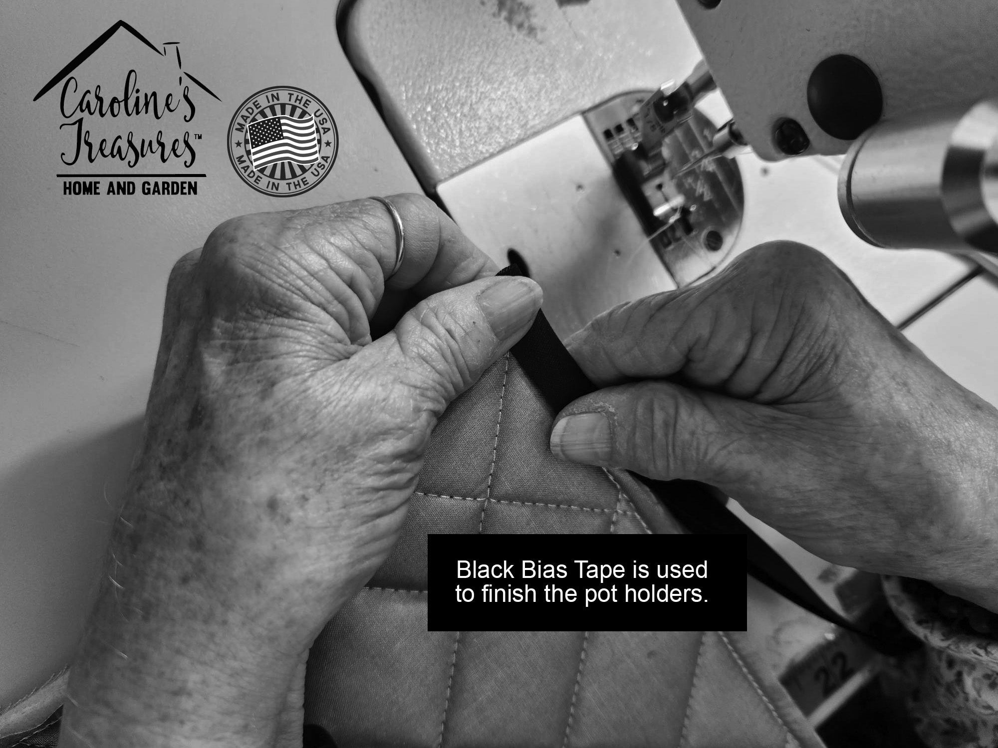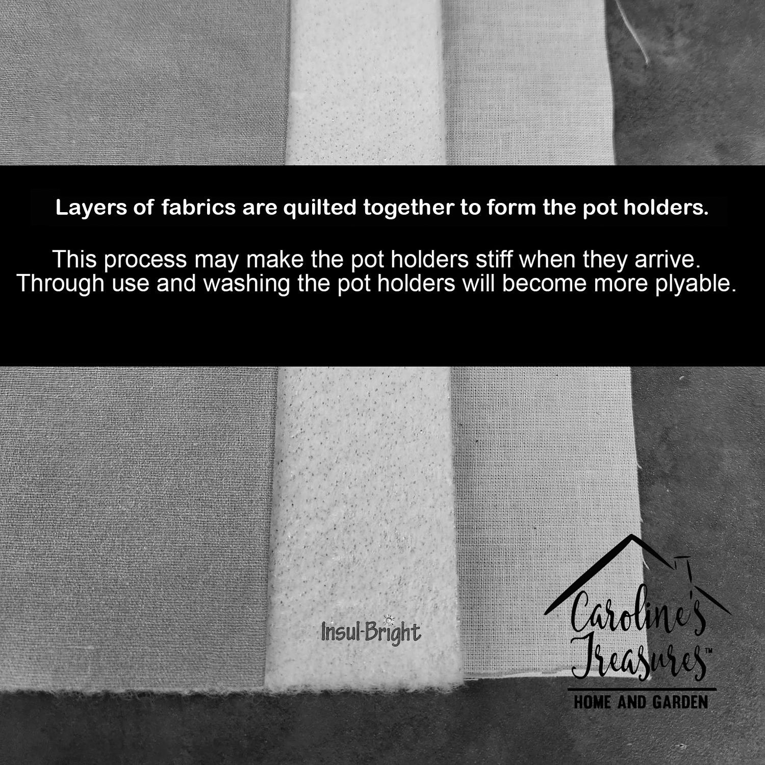 A Pair of Pot Holders to match your kitchen decor. Made in the USA these are thick and functional. Full color artwork decorates the front polyester fabric of the hot pad and accented by a black trim. Use these at as a trivet for your Thanksgiving or Christmas tablescape. Filled with insulated fabric and quilted for durability. These colorful pot holders will make a great gift for your favorite home cook or executive chef. Each pot holder measures approximately 7 1/2 inches by 7 1/2 inches. A hanging tab is included.