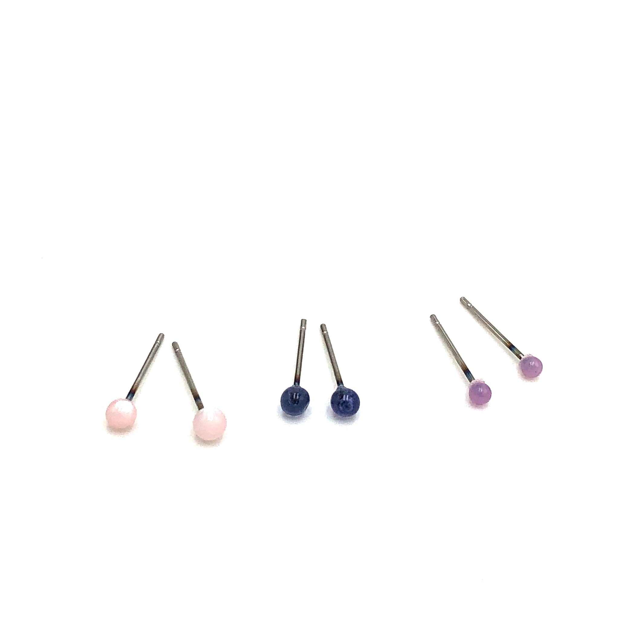 These little studs look like tiny gems! The colors include periwinkle (look like tanzanite), lavender (looks like amethyst), and pink moonglow (similar to rose quartz). Tiny stud earrings in 3mm & 4mm. Small stud earring sizes, great for multi-hole pierced ears or just lots of studs to choose from. All arranged on one card - so these make a great gift!