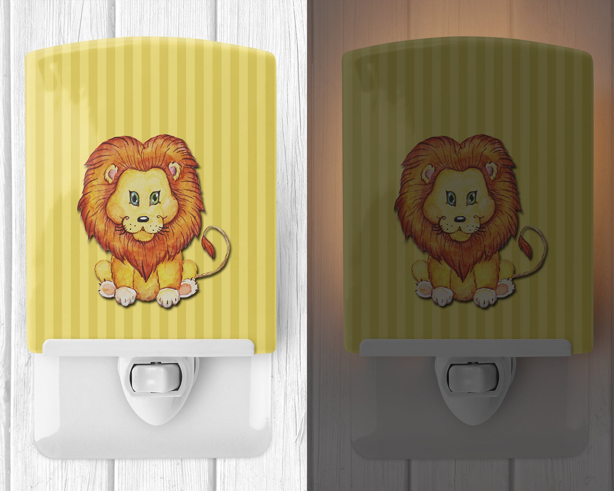 Decorate your space with our Lion artwork on a Night Light. Introduce a splash of artistic flair and subtle illumination to your space with the Decorative Ceramic Night Light from Caroline's Treasures. Perfect for any room, this night light seamlessly blends functionality with an aesthetic appeal, offering a stylish solution to brighten up dark corners of your home or office. Boasting a six-inch high by four-inch wide ceramic tile at the front, it showcases vivid, full-color artwork from distinguished artists, transforming a simple utility into a vibrant art piece. The artwork is securely encased in a robust metal holder, ensuring durability and longevity. Two screws are provided to firmly affix the tile into the holder. The holder extends three inches deep, housing an included bulb that emits a soft, welcoming glow. This product meets all safety standards, as evidenced by its UL approval. Proudly made in the United States from imported components, this Decorative Ceramic Night Light is not just a functional device; it's a statement piece that enhances the ambiance of your surroundings.