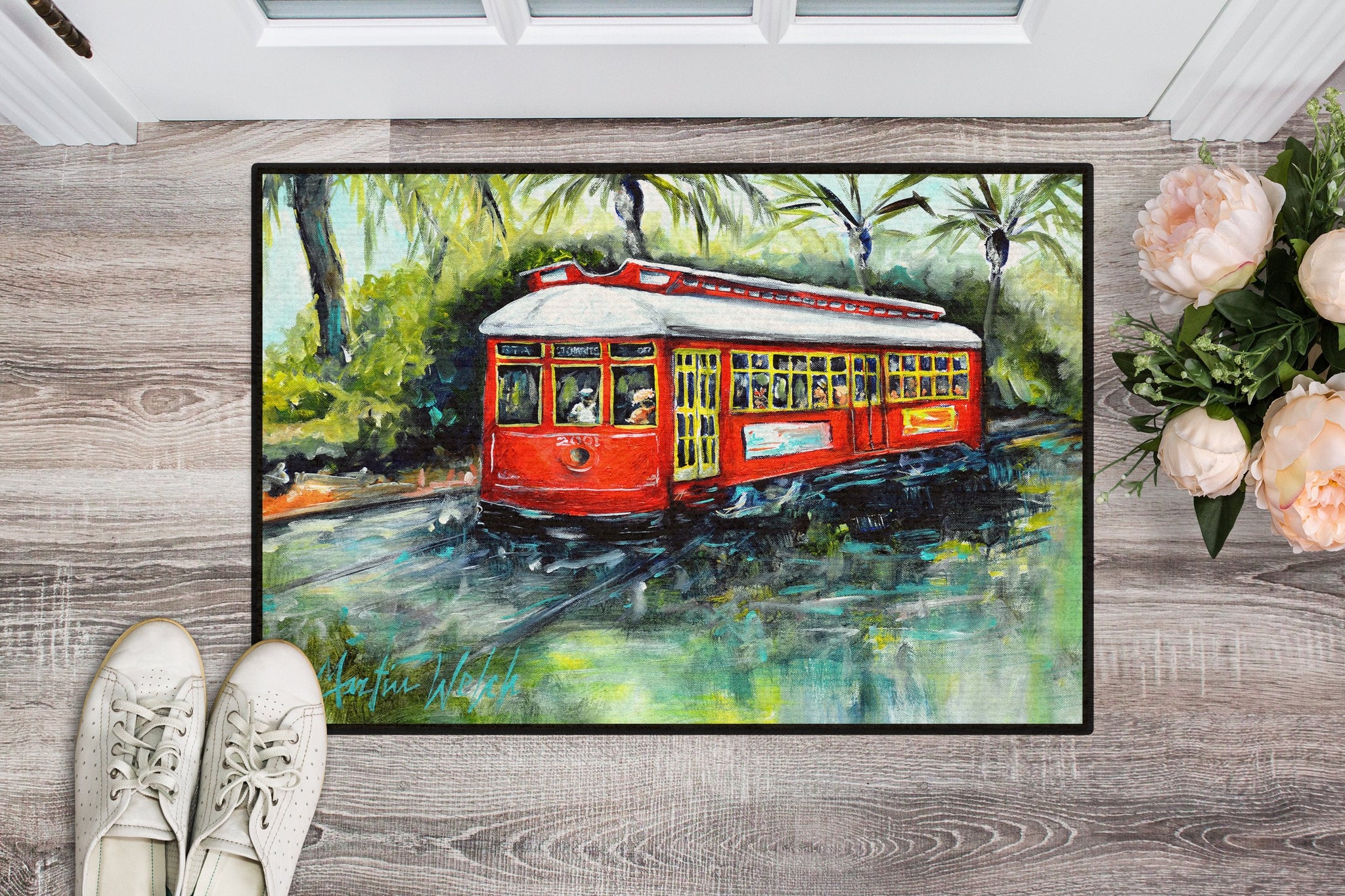 Welcome your guests in style with our Artwork Door Mat, designed to withstand almost any weather condition. This mat, measuring approximately 24 by 36 inches, is held together by durable black binding tape. Its top layer, composed of polyester felt, is dyed with the eye-catching image you see on the mat. A few layers below provide the mat with stability, while its rubber bottom is stamped to help prevent slipping and ensures safety. Our mat works wonderfully as both an indoor or outdoor door mat. For cleaning, simply hose it off with water or use a power washer - no need for any cleaner that produces suds. Avoid scrubbing with a brush, instead, opt for the vacuum on floor setting. Designed manufactured and printed in the USA, this mat is a perfect addition to your porch, outdoor kitchen, entryway, or any indoor space. Its unique design makes it a charming decorative rug that greets your guests and adds a stylish touch to your home decor.