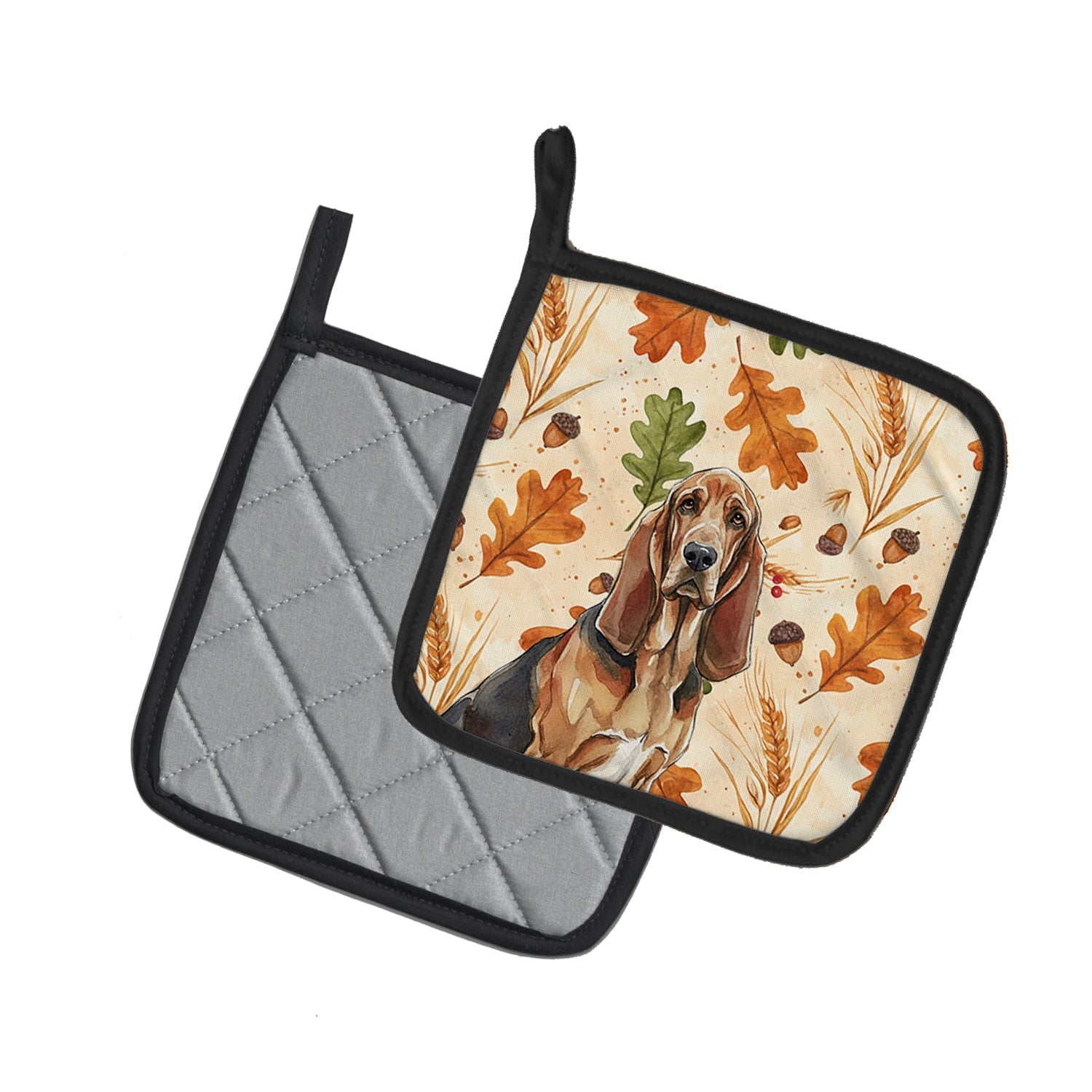 Pair of Pot Holders featuring breed specific Bloodhound artwork. Celebrate Thanksgiving with this Thanksgiving Pair of Pot Holders. Add warmth, personality, and function to your kitchen with our Heirloom Fall Pot Holder Pair. Each set includes two quilted hot pads, featuring original full-color watercolor artwork on a soft polyester front accented by black trim. Crafted with multiple layers for performance: Top Layer: Vibrant artwork permanently dyed into polyester fabric. Middle Layer: US-manufactured insulated material with breathable polyester fibers and a reflective metalized film that reflects heat back to its source. Bottom Layer: A silver heat-resistant backing for extra protection. Each pot holder measures 7.5" x 7.5", includes a hanging tab, and is quilted for durability. Use them to protect your hands, countertops, and tabletops — or as decorative trivets for Thanksgiving, Christmas, or everyday meals.
