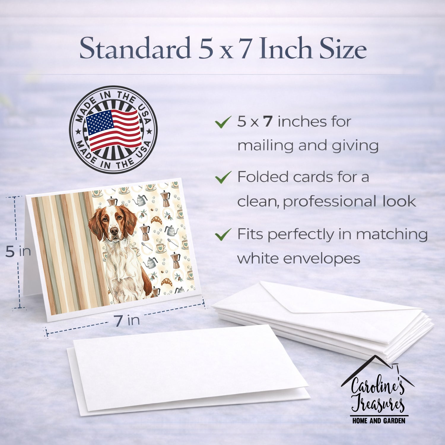 Shown here is the Liver and White Brittany Coffee Bar Greeting Cards Pack of 8 from Caroline's Treasures featuring artwork of a Brittany in a Everyday design. The detailed illustration and vibrant colors make it a standout accent that celebrates both seasonal style and love for the subject. This image features a cozy watercolor coffee-themed pattern with illustrated mugs, moka pots, kettles, croissants, coffee beans, and sugar cubes arranged in a repeating design. Soft neutral tones with warm browns, creams, and subtle sage accents create an inviting, café-inspired look that feels comforting and relaxed. Everyday décor celebrates personal style and the small moments that make a house feel like home. Thoughtful designs add warmth and personality that can be enjoyed year-round. Celebrate special moments with Caroline's Treasures Printed Greeting Card Pack. This pack includes eight beautifully folded 5x7 cards, accompanied by eight matching white envelopes. With blank interiors, these cards provide ample space for your personalized messages and heartfelt holiday greetings. Each card features captivating full-color artwork, meticulously printed in our facility on high-quality 80 lb cover stock or 216 GSM. The super smooth finish of the white cards enhances the visual impact of the artwork, creating a truly stunning presentation. Designed by our talented in-house artists or licensed artists, the artwork on these cards showcases their creativity and attention to detail. From vibrant illustrations to captivating designs, each card tells its own unique story. Whether it's for birthdays, anniversaries, holidays, or any special occasion, Caroline's Treasures Greeting Card Pack is the perfect way to convey your heartfelt sentiments. Share joy, love, and warm wishes with these exquisite cards and make every moment unforgettable. Perfect for: Writing personal messages, everyday correspondence, and thoughtful notes, Dogs-themed stationery collections, or year-round use for Brittany lovers. Brittanys, also known as Brittany Spaniels, are energetic sporting dogs known for their agility and intelligence. This breed is admired for its friendly disposition and strong hunting instincts. Makes a heartfelt gift for: Brittany owners, Dogs lovers, Everyday gifts, pet parents, friends who adore their Brittany, or anyone celebrating Dogs.