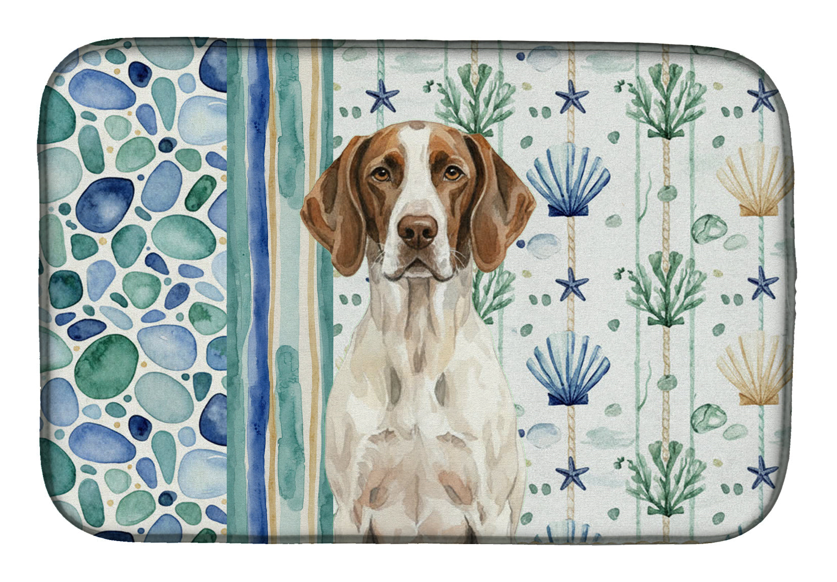 Shown here is the Liver and White Pointer Coastal Sea Glass Dish Drying Mat from Caroline's Treasures featuring artwork of a Pointer in a Everyday design. The detailed illustration and vibrant colors make it a standout accent that celebrates both seasonal style and love for the subject. This image features a calming coastal watercolor pattern with soft seashells, seaweed, starfish, and pebble-inspired accents arranged in a repeating design. The soothing palette of blues, greens, and sandy neutrals creates a relaxed, beach-inspired look that adds a fresh and tranquil feel to any space. Everyday décor celebrates personal style and the small moments that make a house feel like home. Thoughtful designs add warmth and personality that can be enjoyed year-round. Say goodbye to messy countertops and soggy dish towels with our innovative dish drying mat. Our high-quality dish drying pad is designed to keep your countertops dry while offering a stylish and efficient solution. Whether you're air drying dishes, glasses, stemware, silverware, pots, pans, bottles, or even fruits and vegetables, our dish mat is the perfect choice. The 14 inches x 21 inches size fits most counters and dish drying racks, and the non-slip design ensures stability. Made with water-absorbent polyester and a polyurethane foam insert, our dish drying mat is not only functional but also durable. It's machine washable and printed in the USA for long-lasting use. The beautiful artwork adds flair to your kitchen decor, making it a perfect housewarming gift or present for any occasion. Upgrade your kitchen experience with our absorbent and versatile dish drying mat. Perfect for: Kitchen counters and sinks, everyday dish drying and countertop protection, Dogs-themed homes, or year-round use for Pointer lovers. Pointers are athletic sporting dogs known for their focus and endurance. This hunting breed is admired for its intelligence, loyalty, and strong work drive. Makes a heartfelt gift for: Pointer owners, Dogs lovers, Everyday gifts, pet parents, friends who adore their Pointer, or anyone celebrating Dogs.