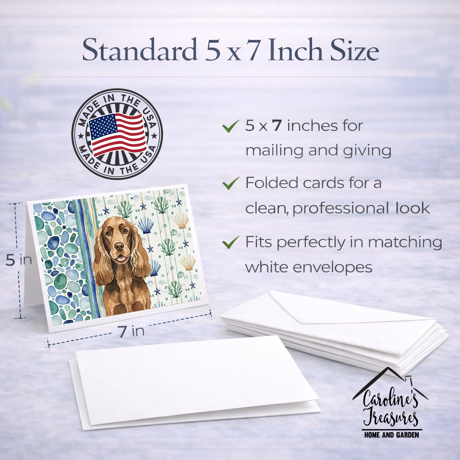 Shown here is the Liver English Cocker Spaniel Coastal Sea Glass Greeting Cards Pack of 8 from Caroline's Treasures featuring artwork of a English Cocker Spaniel in a Everyday design. The detailed illustration and vibrant colors make it a standout accent that celebrates both seasonal style and love for the subject. This image features a calming coastal watercolor pattern with soft seashells, seaweed, starfish, and pebble-inspired accents arranged in a repeating design. The soothing palette of blues, greens, and sandy neutrals creates a relaxed, beach-inspired look that adds a fresh and tranquil feel to any space. Everyday décor celebrates personal style and the small moments that make a house feel like home. Thoughtful designs add warmth and personality that can be enjoyed year-round. Celebrate special moments with Caroline's Treasures Printed Greeting Card Pack. This pack includes eight beautifully folded 5x7 cards, accompanied by eight matching white envelopes. With blank interiors, these cards provide ample space for your personalized messages and heartfelt holiday greetings. Each card features captivating full-color artwork, meticulously printed in our facility on high-quality 80 lb cover stock or 216 GSM. The super smooth finish of the white cards enhances the visual impact of the artwork, creating a truly stunning presentation. Designed by our talented in-house artists or licensed artists, the artwork on these cards showcases their creativity and attention to detail. From vibrant illustrations to captivating designs, each card tells its own unique story. Whether it's for birthdays, anniversaries, holidays, or any special occasion, Caroline's Treasures Greeting Card Pack is the perfect way to convey your heartfelt sentiments. Share joy, love, and warm wishes with these exquisite cards and make every moment unforgettable. Perfect for: Writing personal messages, everyday correspondence, and thoughtful notes, Dogs-themed stationery collections, or year-round use for English Cocker Spaniel lovers. English Cocker Spaniels are cheerful sporting dogs known for their intelligence and affectionate nature. This lively breed is admired for its friendly disposition and strong bond with family. Makes a heartfelt gift for: English Cocker Spaniel owners, Dogs lovers, Everyday gifts, pet parents, friends who adore their English Cocker Spaniel, or anyone celebrating Dogs.