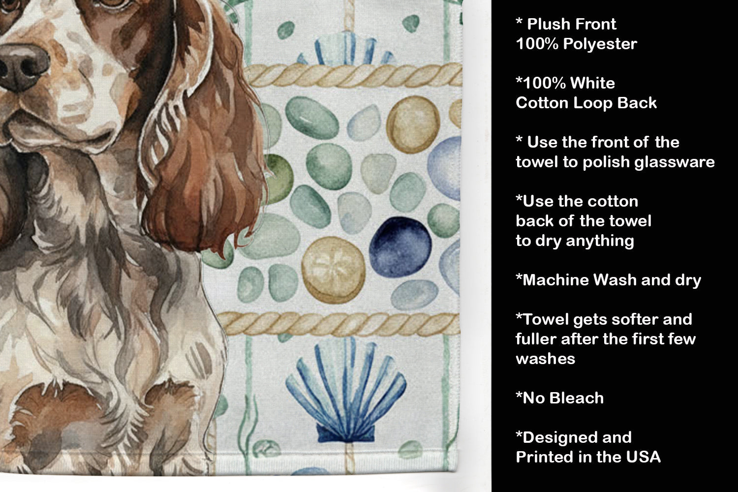 Kitchen Towel featuring breed specific English Cocker Spaniel artwork. Bring breezy coastal charm to your kitchen or bath with our plush velour towel featuring original watercolor artwork. The soft minky polyester front showcases vivid seashell and starfish designs with a dog portrait, perfect for polishing glassware to a brilliant shine. The 100% cotton terry loop back delivers superior absorbency for drying hands, dishes, or counters. Artwork is dyed directly into the fibers for lasting color that won’t crack or peel. Each towel measures 15" x 25", with bound edges to maintain shape after repeated washes. Machine washable and tumble dry low for easy care. Designed and printed in the USA, these towels combine function and style—ideal for beach homes, coastal kitchens, or as thoughtful gifts.