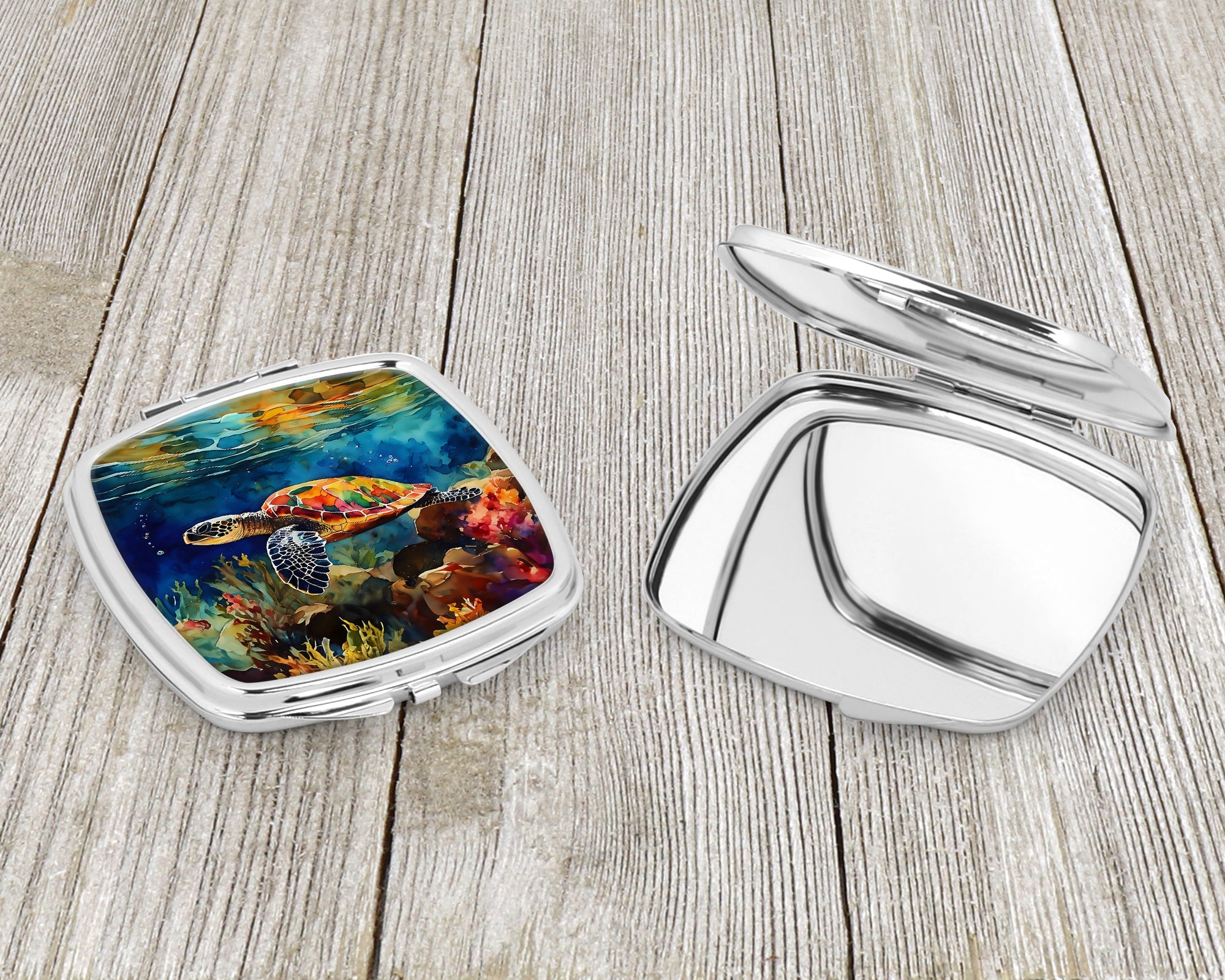 Decorate your space with our Loggerhead Sea Turtle artwork on a Compact Mirror. Introducing our Square Compact Mirror, a blend of elegance, functionality, and compactness, perfect for on-the-go touch-ups. This Silvertone metal mirror, with dimensions of 2.75 inches x 3 inches x .3 inches, fits effortlessly into your purse, handbag, or pocket, ensuring that you can check your appearance anytime, anywhere. Our compact mirror stands out with its eye-catching artwork on the front, adding a dash of style to this practical accessory. It is more than just a mirror; it's a statement piece that reflects your personality and aesthetic. When opened, this compact reveals two mirrors inside, doubling your perspective for precise touch-ups. The Silvertone metal construction ensures durability while maintaining a lightweight feel, making it an ideal everyday carry item. Whether you're rushing to a meeting, prepping for a dinner date, or just need a quick check on your look, our Square Compact Mirror is your reliable companion. Experience the perfect blend of style and practicality with this must-have accessory.