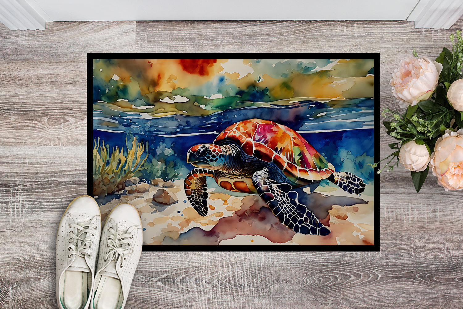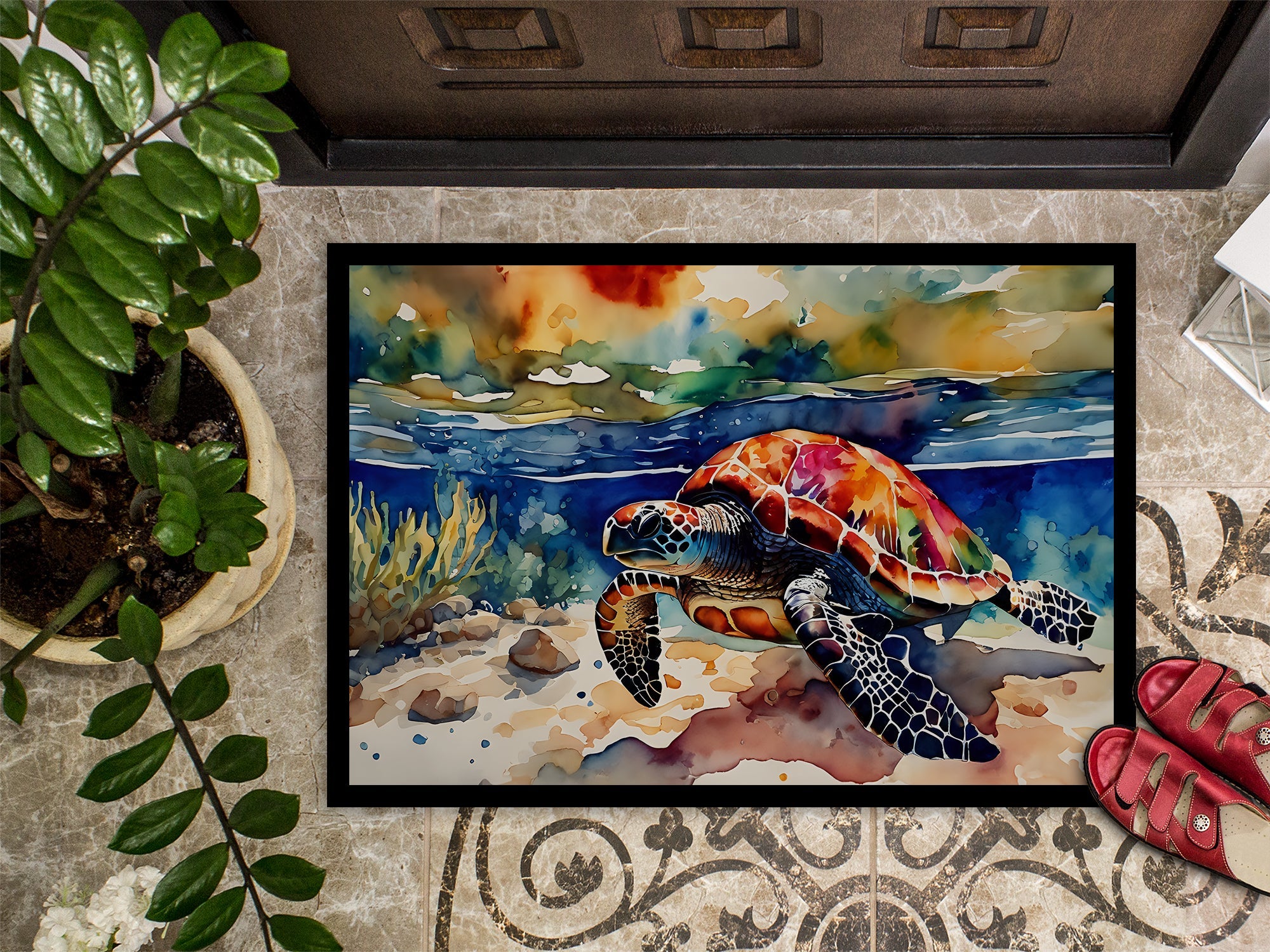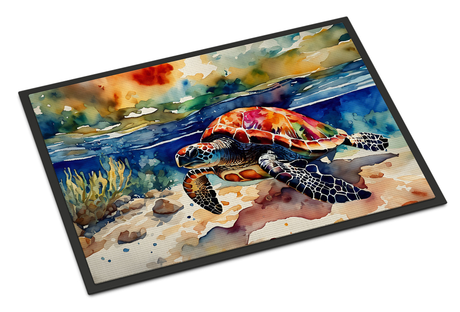 Decorate your space with our Loggerhead Sea Turtle artwork on a Doormat. Welcome your guests in style with our Artwork Door Mat, designed to withstand almost any weather condition. This mat, measuring approximately 18 by 27 inches, is held together by durable black binding tape. Its top layer, composed of polyester felt, is dyed with the eye-catching image you see on the mat. A few layers below provide the mat with stability, while its rubber bottom is stamped to help prevent slipping and ensures safety. Our mat works wonderfully as both an indoor or outdoor door mat. For cleaning, simply hose it off with water or use a power washer - no need for any cleaner that produces suds. Avoid scrubbing with a brush, instead, opt for the vacuum on floor setting. Designed manufactured and printed in the USA, this mat is a perfect addition to your porch, outdoor kitchen, entryway, or any indoor space. Its unique design makes it a charming decorative rug that greets your guests and adds a stylish touch to your home decor.