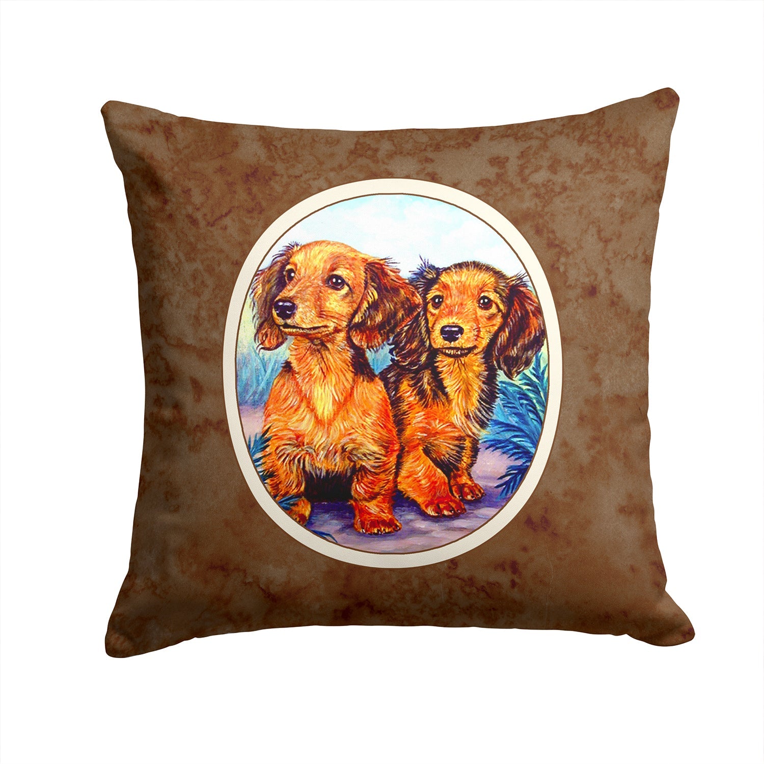 Decorate your space with our Dachshund artwork on a Pillow. Add a touch of vibrancy and comfort to your outdoor seating with Caroline's Treasures Fabric Decorative Pillow. Measuring approximately 14 inches by 14 inches, this outdoor pillow is crafted to elevate the appeal of your patio furniture, infusing it with vivid color and artistic flair. The pillow includes a 100% Polyester Fabric sham filled with a quality pillow form to provide superior comfort. Innovatively made from our brand new material, specifically woven for its water resistance, this pillow is designed for durability. The soft canvas fabric offers versatility in use, fit for your indoor couch or your outdoor patio, porch, or veranda. The fabric is dyed with colorfast dyes built for resilience against weather conditions, ensuring the pillow retains its beauty over time. Constructed by sewing three fabric pieces to create a sham, the polyester insert is then nestled inside to form the pillow, resulting in an overstuffed pillow that maintains its shape. Both the sham and the pillow insert are proudly made in the United States. As the pillows are handcrafted, there may be minor variations in size, further enhancing their unique charm. Experience comfort in style with Caroline's Treasures Fabric Decorative Pillow.