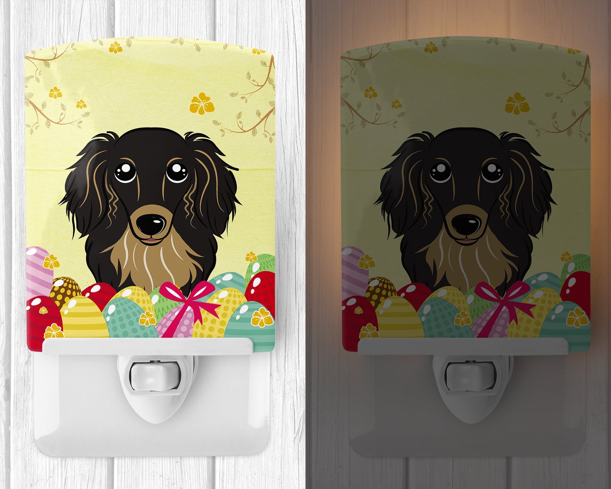 Decorate your space with our Easter Dachshund artwork on a Night Light. Introduce a splash of artistic flair and subtle illumination to your space with the Decorative Ceramic Night Light from Caroline's Treasures. Perfect for any room, this night light seamlessly blends functionality with an aesthetic appeal, offering a stylish solution to brighten up dark corners of your home or office. Boasting a six-inch high by four-inch wide ceramic tile at the front, it showcases vivid, full-color artwork from distinguished artists, transforming a simple utility into a vibrant art piece. The artwork is securely encased in a robust metal holder, ensuring durability and longevity. Two screws are provided to firmly affix the tile into the holder. The holder extends three inches deep, housing an included bulb that emits a soft, welcoming glow. This product meets all safety standards, as evidenced by its UL approval. Proudly made in the United States from imported components, this Decorative Ceramic Night Light is not just a functional device; it's a statement piece that enhances the ambiance of your surroundings.