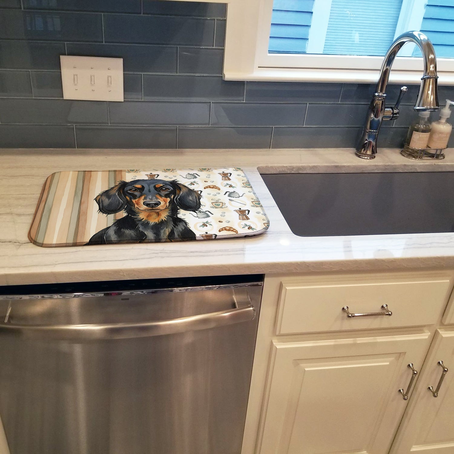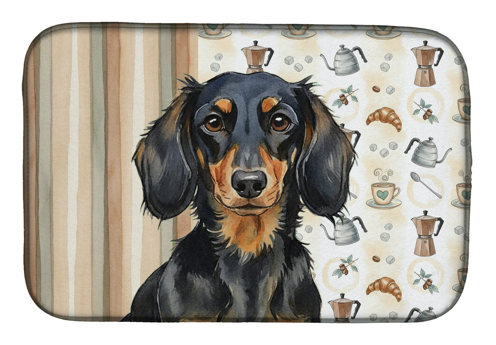 Shown here is the Longhaired Black and Tan Dachshund Coffee Bar Dish Drying Mat from Caroline's Treasures featuring artwork of a Dachshund in a Everyday design. The detailed illustration and vibrant colors make it a standout accent that celebrates both seasonal style and love for the subject. This image features a cozy watercolor coffee-themed pattern with illustrated mugs, moka pots, kettles, croissants, coffee beans, and sugar cubes arranged in a repeating design. Soft neutral tones with warm browns, creams, and subtle sage accents create an inviting, café-inspired look that feels comforting and relaxed. Everyday décor celebrates personal style and the small moments that make a house feel like home. Thoughtful designs add warmth and personality that can be enjoyed year-round. Say goodbye to messy countertops and soggy dish towels with our innovative dish drying mat. Our high-quality dish drying pad is designed to keep your countertops dry while offering a stylish and efficient solution. Whether you're air drying dishes, glasses, stemware, silverware, pots, pans, bottles, or even fruits and vegetables, our dish mat is the perfect choice. The 14 inches x 21 inches size fits most counters and dish drying racks, and the non-slip design ensures stability. Made with water-absorbent polyester and a polyurethane foam insert, our dish drying mat is not only functional but also durable. It's machine washable and printed in the USA for long-lasting use. The beautiful artwork adds flair to your kitchen decor, making it a perfect housewarming gift or present for any occasion. Upgrade your kitchen experience with our absorbent and versatile dish drying mat. Perfect for: Kitchen counters and sinks, everyday dish drying and countertop protection, Dogs-themed homes, or year-round use for Dachshund lovers. Dachshunds are bold hounds known for their long bodies and confident personality. Often called wiener dogs, this breed is loved for its loyalty, courage, and playful spirit. Makes a heartfelt gift for: Dachshund owners, Dogs lovers, Everyday gifts, pet parents, friends who adore their Dachshund, or anyone celebrating Dogs.