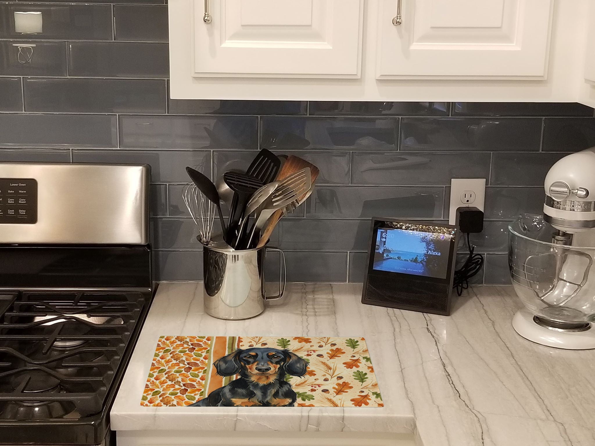 Glass Cutting Board featuring breed specific Dachshund artwork. Celebrate Thanksgiving with this Thanksgiving Cutting Board. Introduce your kitchen to the vibrant, large Decorative Glass Cutting Board from Caroline's Treasures. Crafted from resilient tempered glass, this board is not only a utilitarian necessity but also a colorful art piece. With its generous dimensions of 15 inches in height and 12 inches in length, it offers ample space for all your cutting needs. Every piece showcases captivating artwork from distinguished artists, bringing an aesthetic edge to your kitchen. Beyond its attractive design, this cutting board ensures your countertop stays pristine and unscathed, owing to its heat-resistant properties. Engineered with user convenience in mind, it features non-skid feet for stability, and rounded corners for additional safety. Its robust construction renders it virtually unbreakable, guaranteeing longevity. The board comes with protective feet bumpers, maintaining its position during use. This product is recommended to be hand washed only. Proudly printed and assembled in the United States, this cutting board exemplifies superior craftsmanship. With Caroline's Treasures' Decorative Glass Cutting Board, you're investing in a blend of functionality and artistic flair.