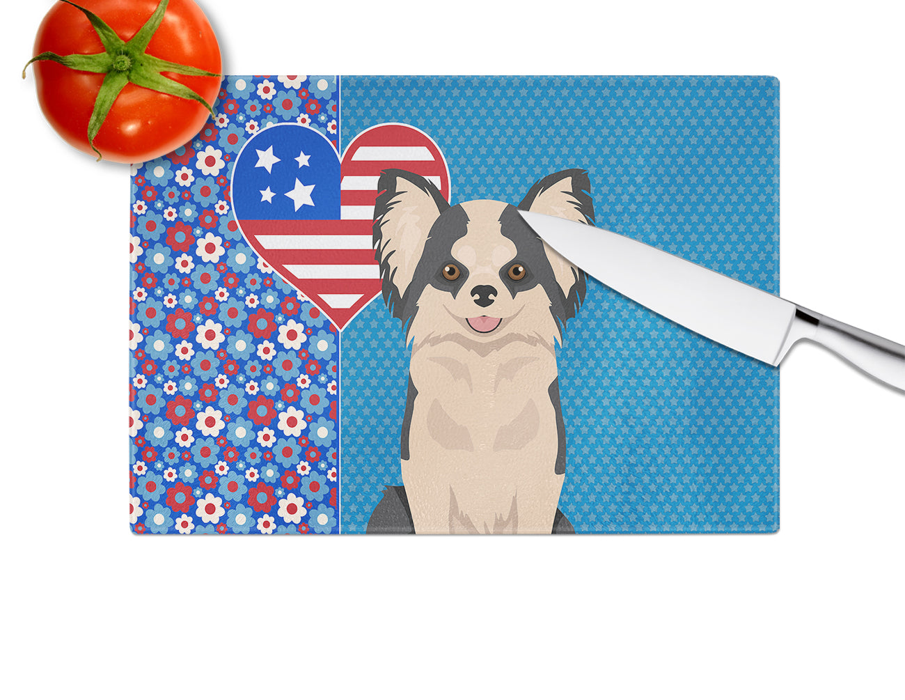 Longhaired Black and White #2 Chihuahua USA American Glass Cutting Boards – Durable, Decorative Kitchen Art Large