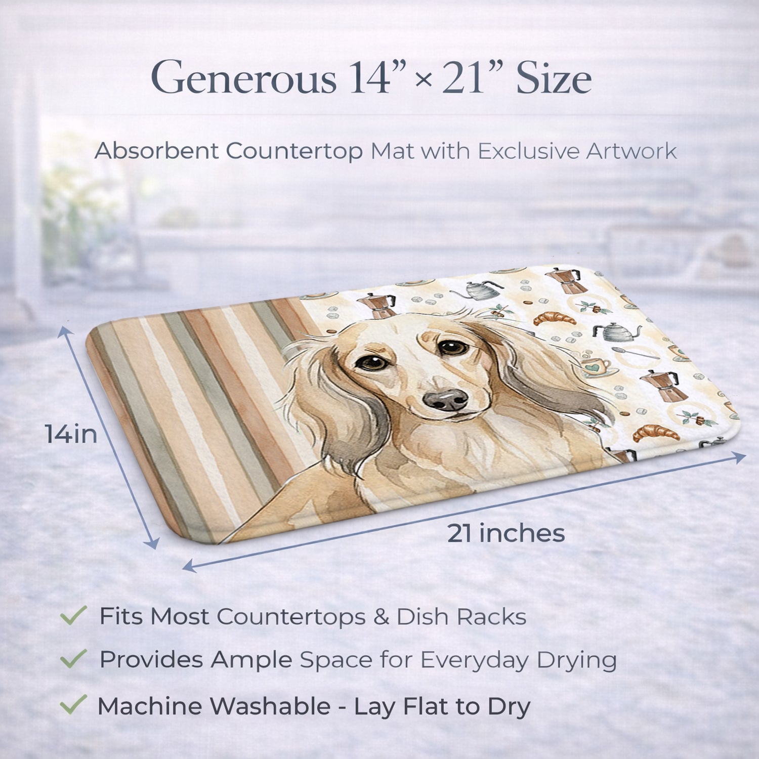 Shown here is the Longhaired Cream Dachshund Coffee Bar Dish Drying Mat from Caroline's Treasures featuring artwork of a Dachshund in a Everyday design. The detailed illustration and vibrant colors make it a standout accent that celebrates both seasonal style and love for the subject. This image features a cozy watercolor coffee-themed pattern with illustrated mugs, moka pots, kettles, croissants, coffee beans, and sugar cubes arranged in a repeating design. Soft neutral tones with warm browns, creams, and subtle sage accents create an inviting, café-inspired look that feels comforting and relaxed. Everyday décor celebrates personal style and the small moments that make a house feel like home. Thoughtful designs add warmth and personality that can be enjoyed year-round. Say goodbye to messy countertops and soggy dish towels with our innovative dish drying mat. Our high-quality dish drying pad is designed to keep your countertops dry while offering a stylish and efficient solution. Whether you're air drying dishes, glasses, stemware, silverware, pots, pans, bottles, or even fruits and vegetables, our dish mat is the perfect choice. The 14 inches x 21 inches size fits most counters and dish drying racks, and the non-slip design ensures stability. Made with water-absorbent polyester and a polyurethane foam insert, our dish drying mat is not only functional but also durable. It's machine washable and printed in the USA for long-lasting use. The beautiful artwork adds flair to your kitchen decor, making it a perfect housewarming gift or present for any occasion. Upgrade your kitchen experience with our absorbent and versatile dish drying mat. Perfect for: Kitchen counters and sinks, everyday dish drying and countertop protection, Dogs-themed homes, or year-round use for Dachshund lovers. Dachshunds are bold hounds known for their long bodies and confident personality. Often called wiener dogs, this breed is loved for its loyalty, courage, and playful spirit. Makes a heartfelt gift for: Dachshund owners, Dogs lovers, Everyday gifts, pet parents, friends who adore their Dachshund, or anyone celebrating Dogs.