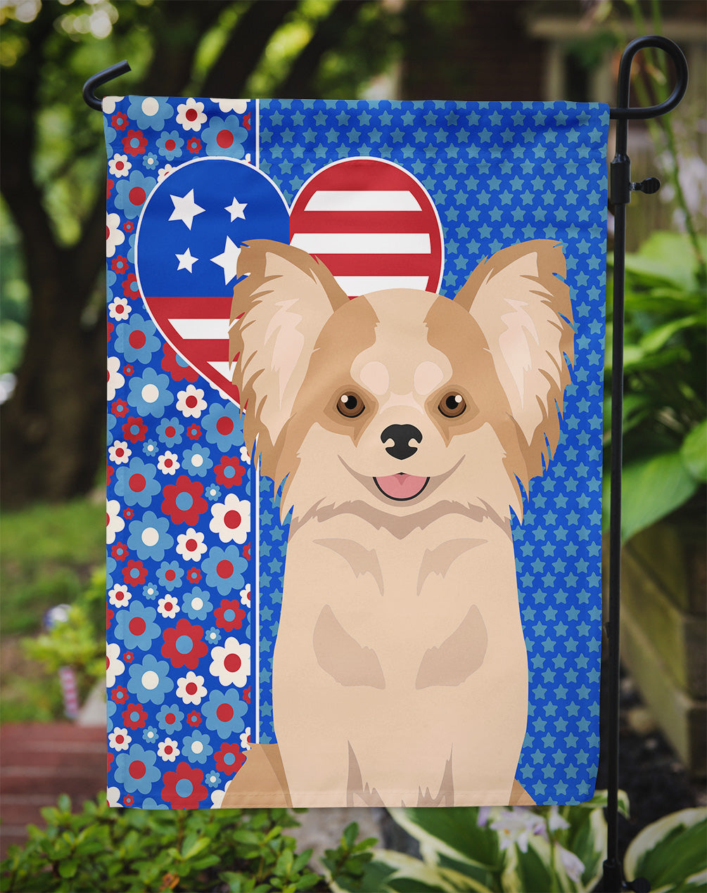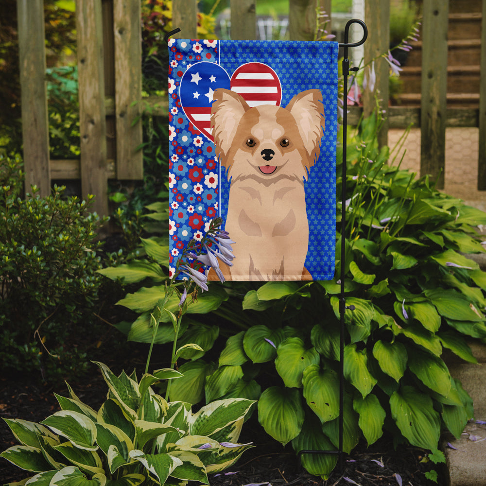 Longhaired Gold and White Chihuahua Patriotic Heart Garden Flag – Red, White & Blue Dog Decor with Star Background