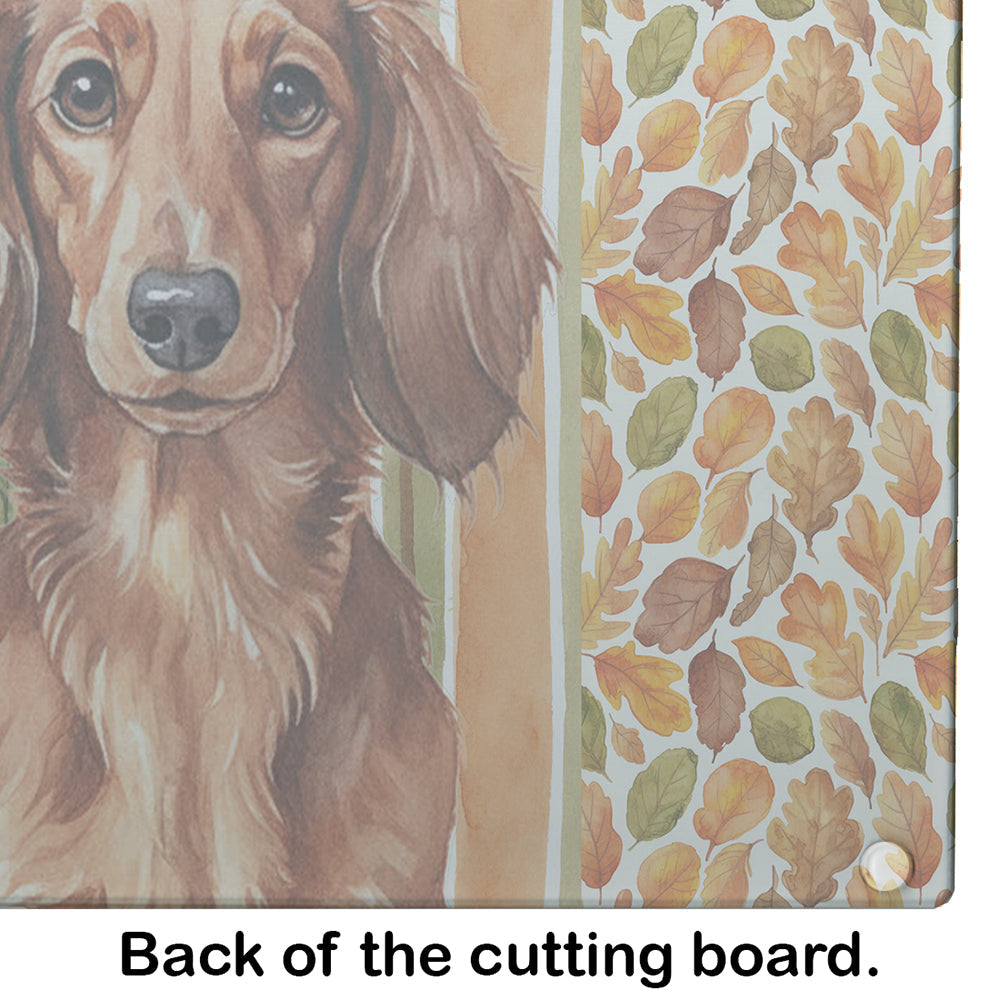 Glass Cutting Board featuring breed specific Dachshund artwork. Celebrate Thanksgiving with this Thanksgiving Cutting Board. Introduce your kitchen to the vibrant, large Decorative Glass Cutting Board from Caroline's Treasures. Crafted from resilient tempered glass, this board is not only a utilitarian necessity but also a colorful art piece. With its generous dimensions of 15 inches in height and 12 inches in length, it offers ample space for all your cutting needs. Every piece showcases captivating artwork from distinguished artists, bringing an aesthetic edge to your kitchen. Beyond its attractive design, this cutting board ensures your countertop stays pristine and unscathed, owing to its heat-resistant properties. Engineered with user convenience in mind, it features non-skid feet for stability, and rounded corners for additional safety. Its robust construction renders it virtually unbreakable, guaranteeing longevity. The board comes with protective feet bumpers, maintaining its position during use. This product is recommended to be hand washed only. Proudly printed and assembled in the United States, this cutting board exemplifies superior craftsmanship. With Caroline's Treasures' Decorative Glass Cutting Board, you're investing in a blend of functionality and artistic flair.