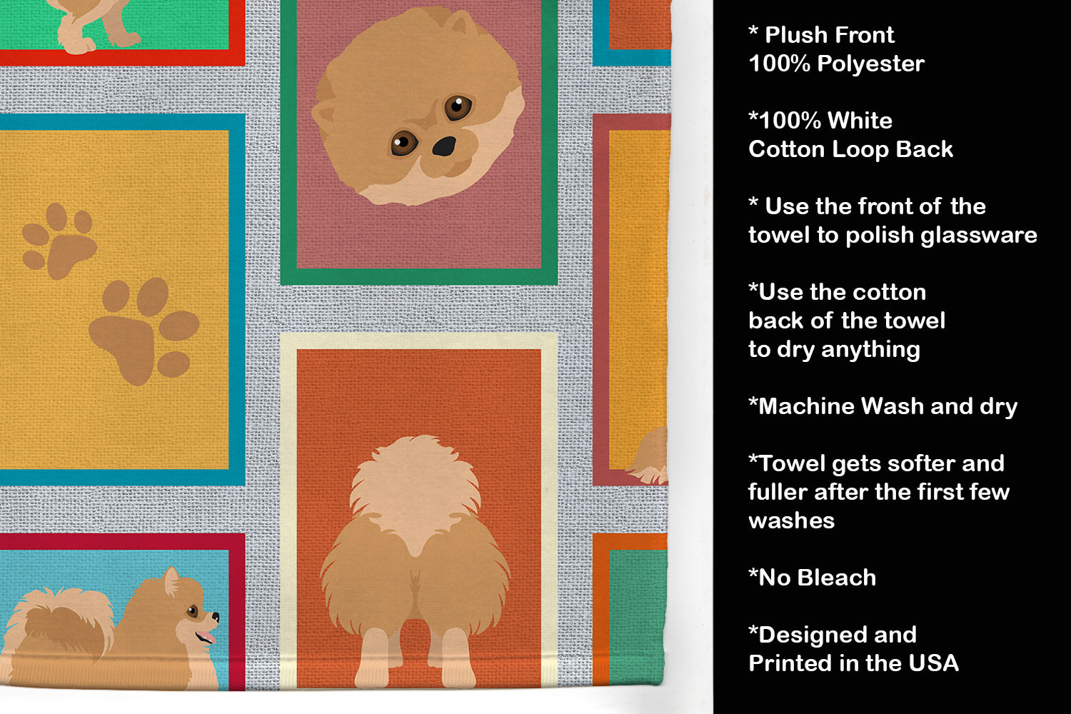 Decorate your space with our Pomeranian artwork on a Kitchen Towel. Experience the perfect blend of aesthetic appeal and functional excellence with our Plush Velour Kitchen Towels. These are not your ordinary decorative kitchen towels that gather dust. Instead, they are designed to be as practical as they are stylish. The front layer of our towel is constructed from a minky plush polyester, known for its durability and color retention. Unlike conventional kitchen towels, the artwork on our towels is dyed directly into the fabric, ensuring vibrant colors that last. Polish your glassware to a brilliant sparkle using the plush front side of the towel. Flip to the back, crafted from 100% cotton terry loop, to exploit its exceptional absorbency for drying dishes or wiping down counters. Our kitchen towels redefine the concept of functional art, offering lasting quality that maintains the towel's shape over time. Measuring 15 inches by 25 inches and weighing 2.3 lbs per dozen, these towels deliver an overwhelming sensory experience with their soft, plush, and smooth texture. The edges are meticulously finished with binding, enhancing their durability and visual appeal. For your convenience, these towels are machine washable and can be dried on low heat. After the first wash, the top fabric becomes even softer and fluffier, eliminating the need for ironing. Treat your kitchen to the luxury and functionality it deserves with our plush velour kitchen towels.