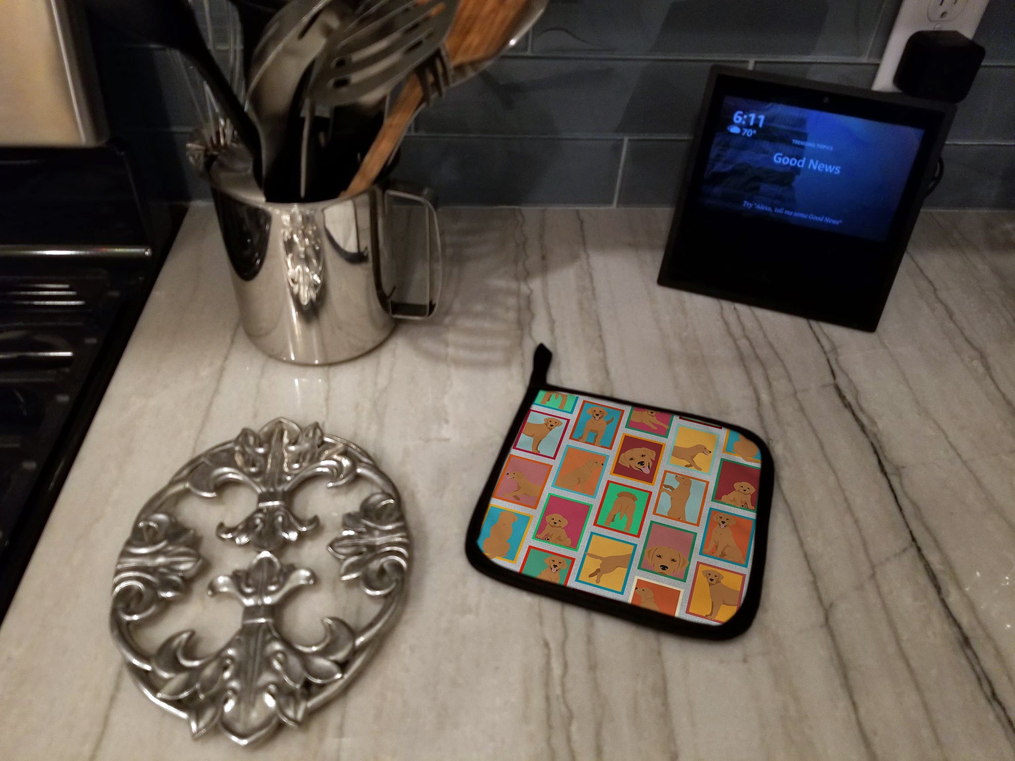 Decorate your space with our Labrador Retriever artwork on a Pair of Pot Holders. A Pair of Pot Holders to match your kitchen decor. Made in the USA these are thick and functional. Full color artwork decorates the front polyester fabric of the hot pad and accented by a black trim. Use these at as a trivet for your Thanksgiving or Christmas tablescape. Filled with insulated fabric and quilted for durability. These colorful pot holders will make a great gift for your favorite home cook or executive chef. Each pot holder measures approximately 7 1/2 inches by 7 1/2 inches. A hanging tab is included.