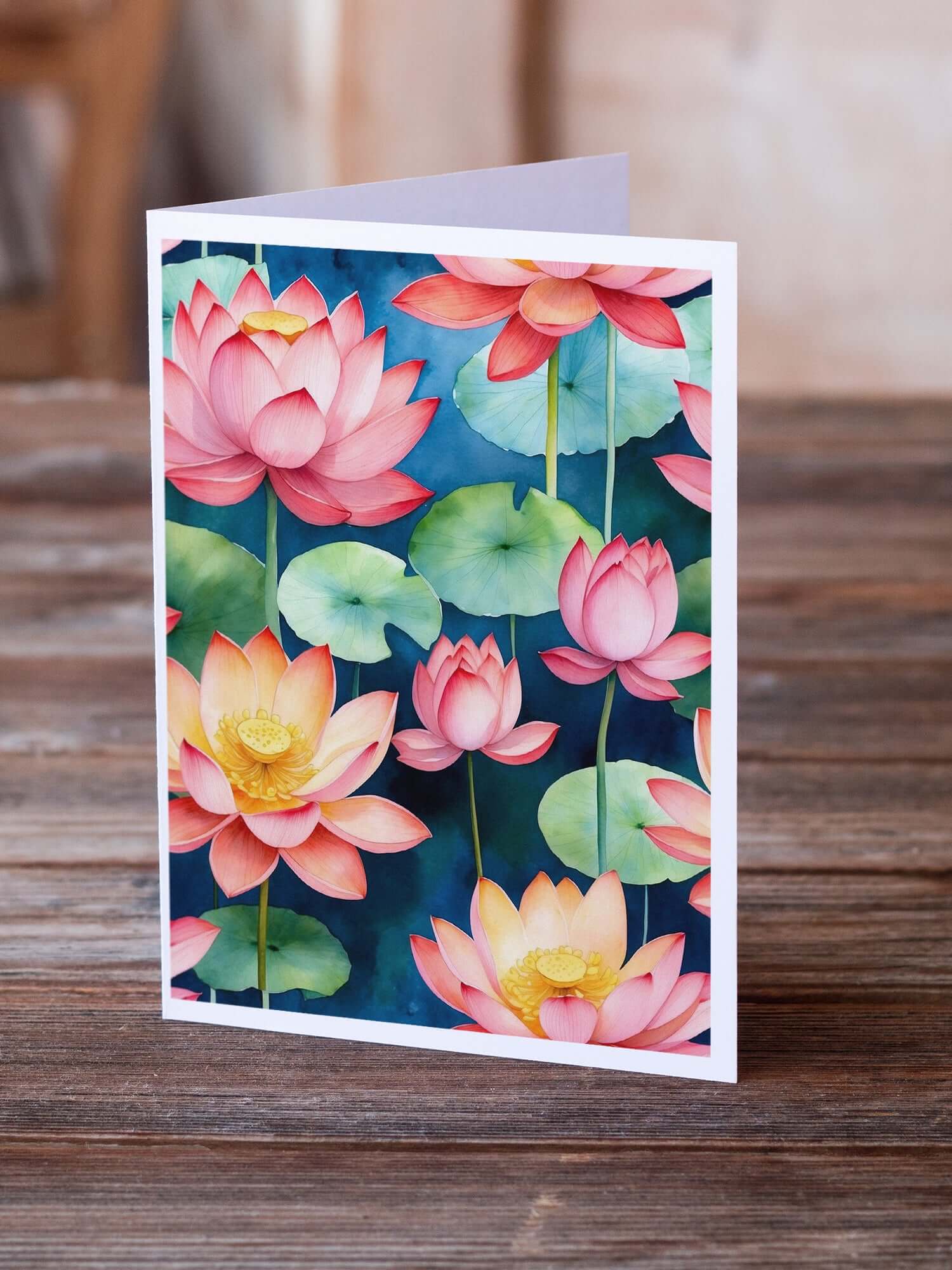 Greeting Cards Pack of 8 featuring breed specific Lotus Flowers artwork. Celebrate special moments with Caroline's Treasures Printed Greeting Card Pack. This pack includes eight beautifully folded 5x7 cards, accompanied by eight matching white envelopes. With blank interiors, these cards provide ample space for your personalized messages and heartfelt holiday greetings. Each card features captivating full-color artwork, meticulously printed in our facility on high-quality 80 lb cover stock or 216 GSM. The super smooth finish of the white cards enhances the visual impact of the artwork, creating a truly stunning presentation. Designed by our talented in-house artists or licensed artists, the artwork on these cards showcases their creativity and attention to detail. From vibrant illustrations to captivating designs, each card tells its own unique story. Whether it's for birthdays, anniversaries, holidays, or any special occasion, Caroline's Treasures Greeting Card Pack is the perfect way to convey your heartfelt sentiments. Share joy, love, and warm wishes with these exquisite cards and make every moment unforgettable.