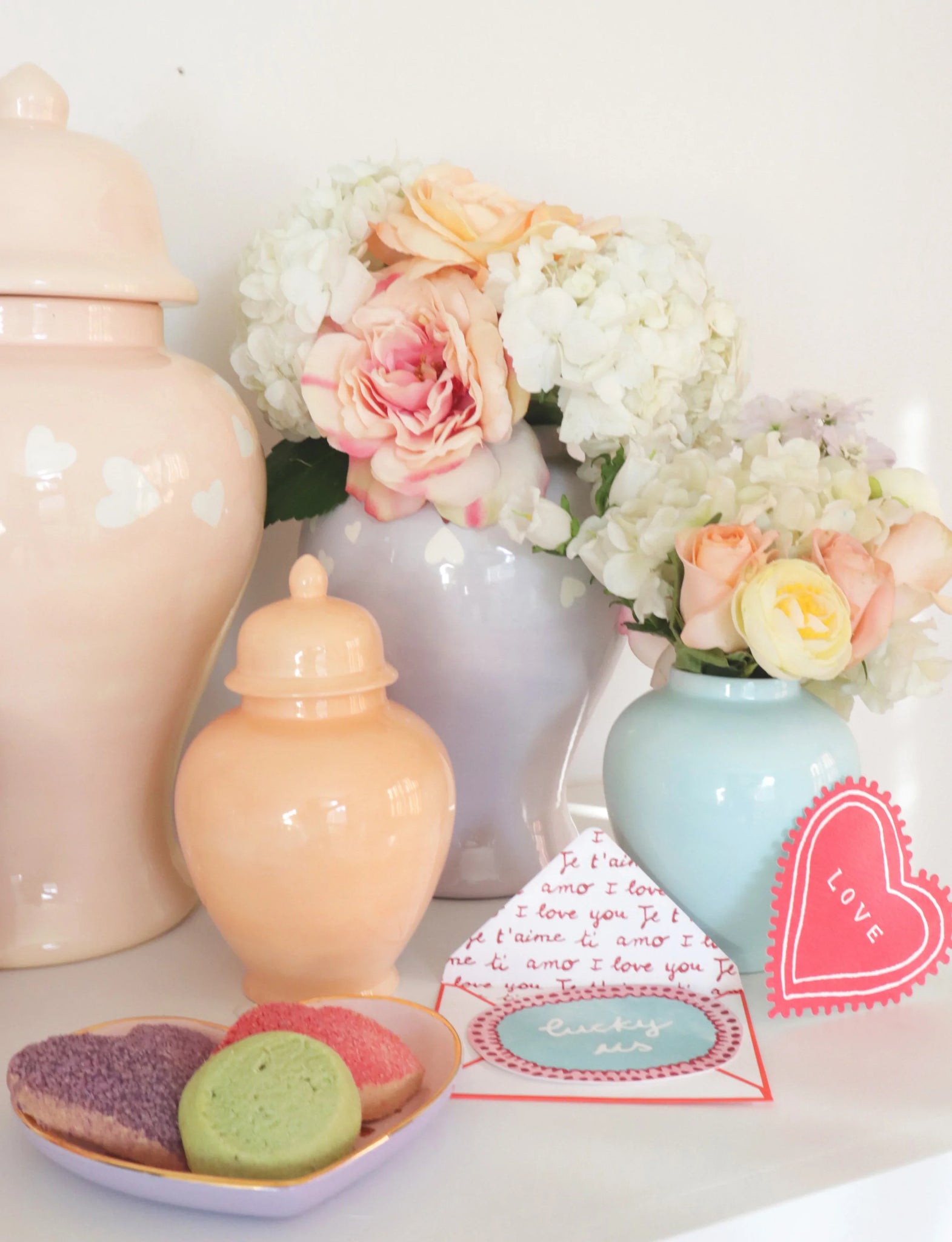 We are in LOVE with these darling ginger jars and hope you will be too! Add a little extra love to your home this season with these cheerful and beautiful jars adorned with delicate floating hearts. Lovely as jars or filled with freshly picked blooms, these hand-made beauties make wonderful gifts, or add a festive touch to any room for Valentine's Day and beyond!