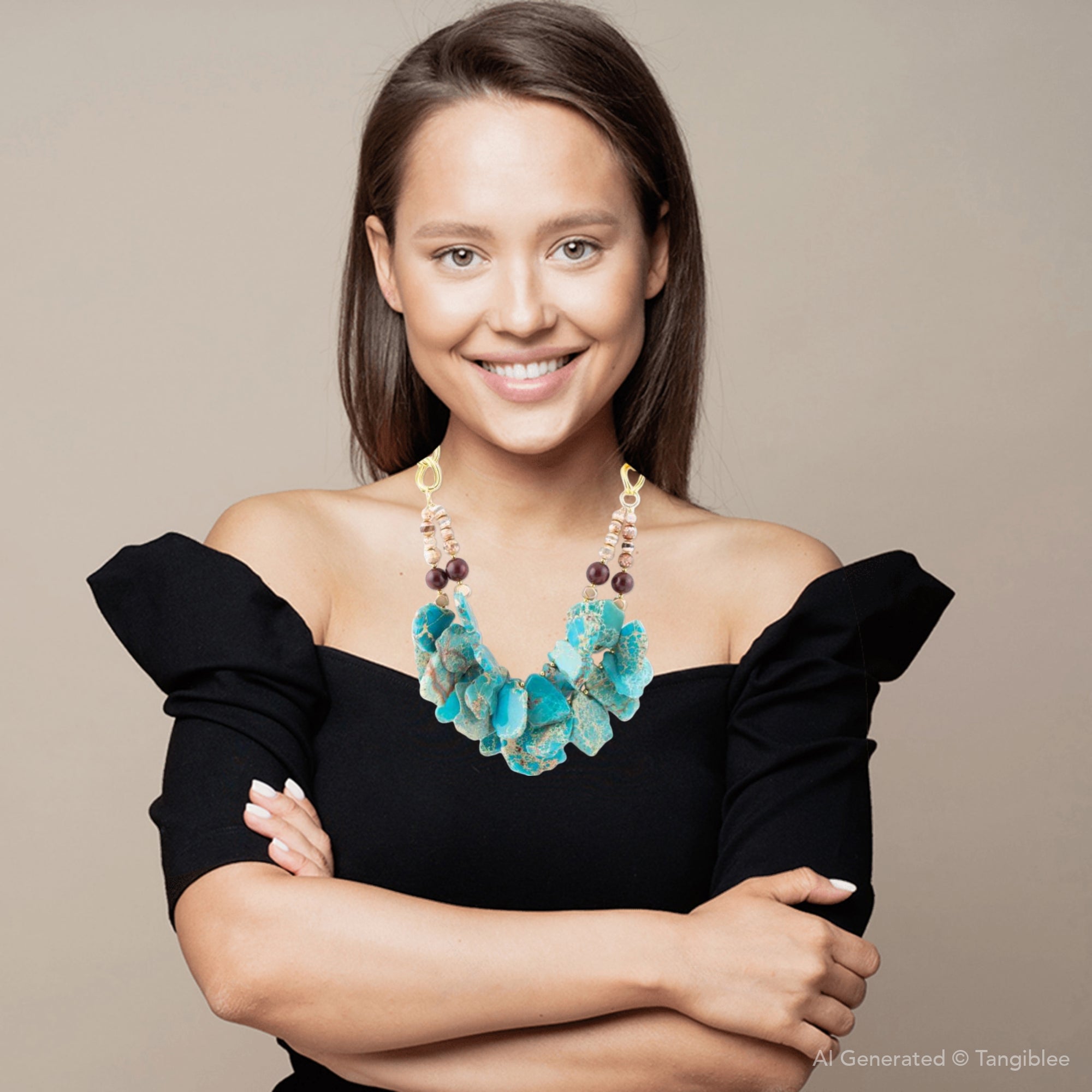 Individually crafted and lovingly finished by hand, this stunning necklace features two strands adorned with genuine fire agate, genuine blue jasper, and warm wood beads. Its elegant design is accentuated by a gleaming golden brass chain measuring 21 inches in length, with an additional 2-inch chain extender and a secure lobster clasp. With its widest point at 1.75 inches, this necklace is a true statement piece with a total weight of 10.24 ounces. Experience the beauty and artistry of Lucia Blue Jasper and Fire Agate Golden Strand Necklace.