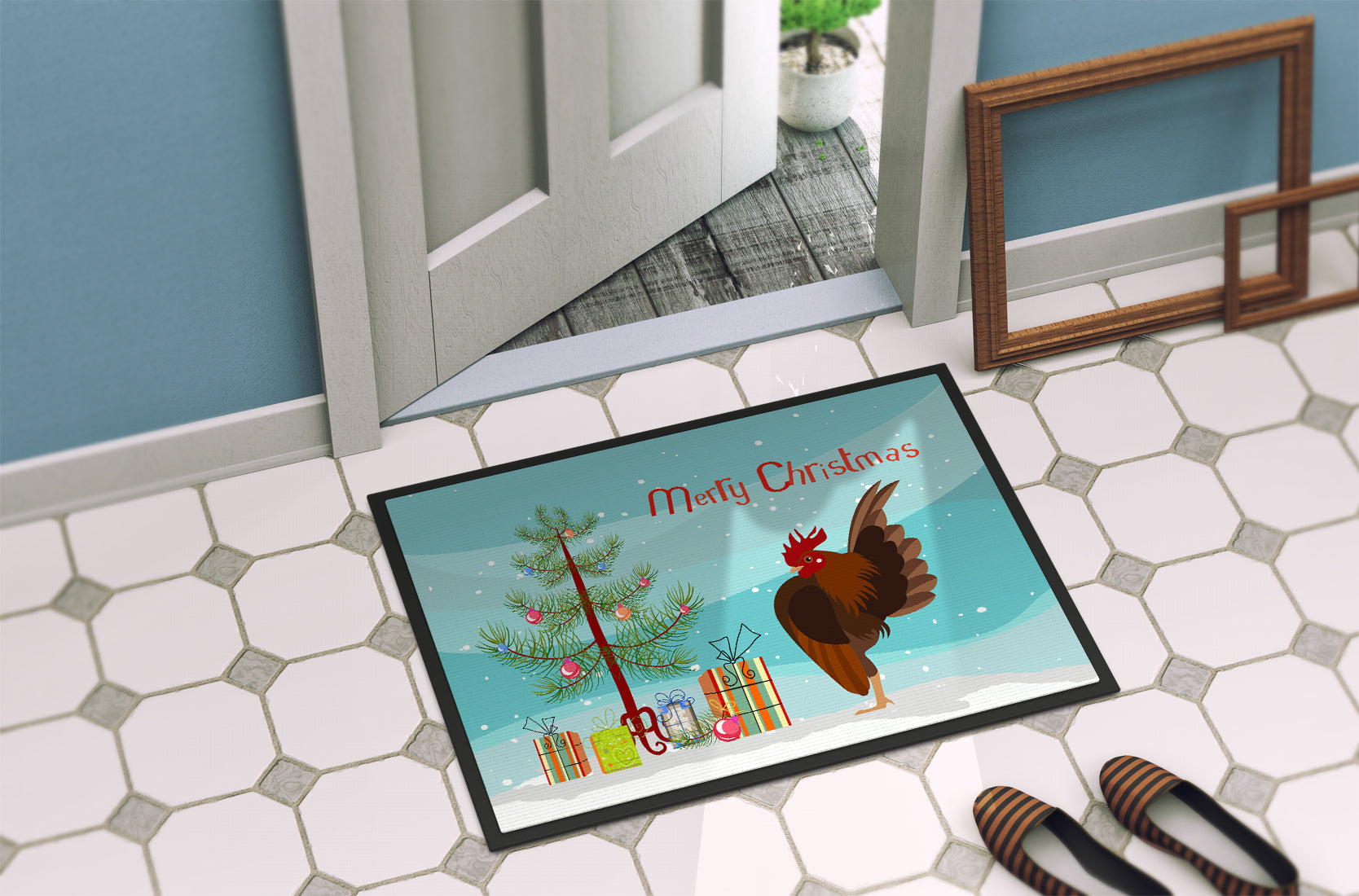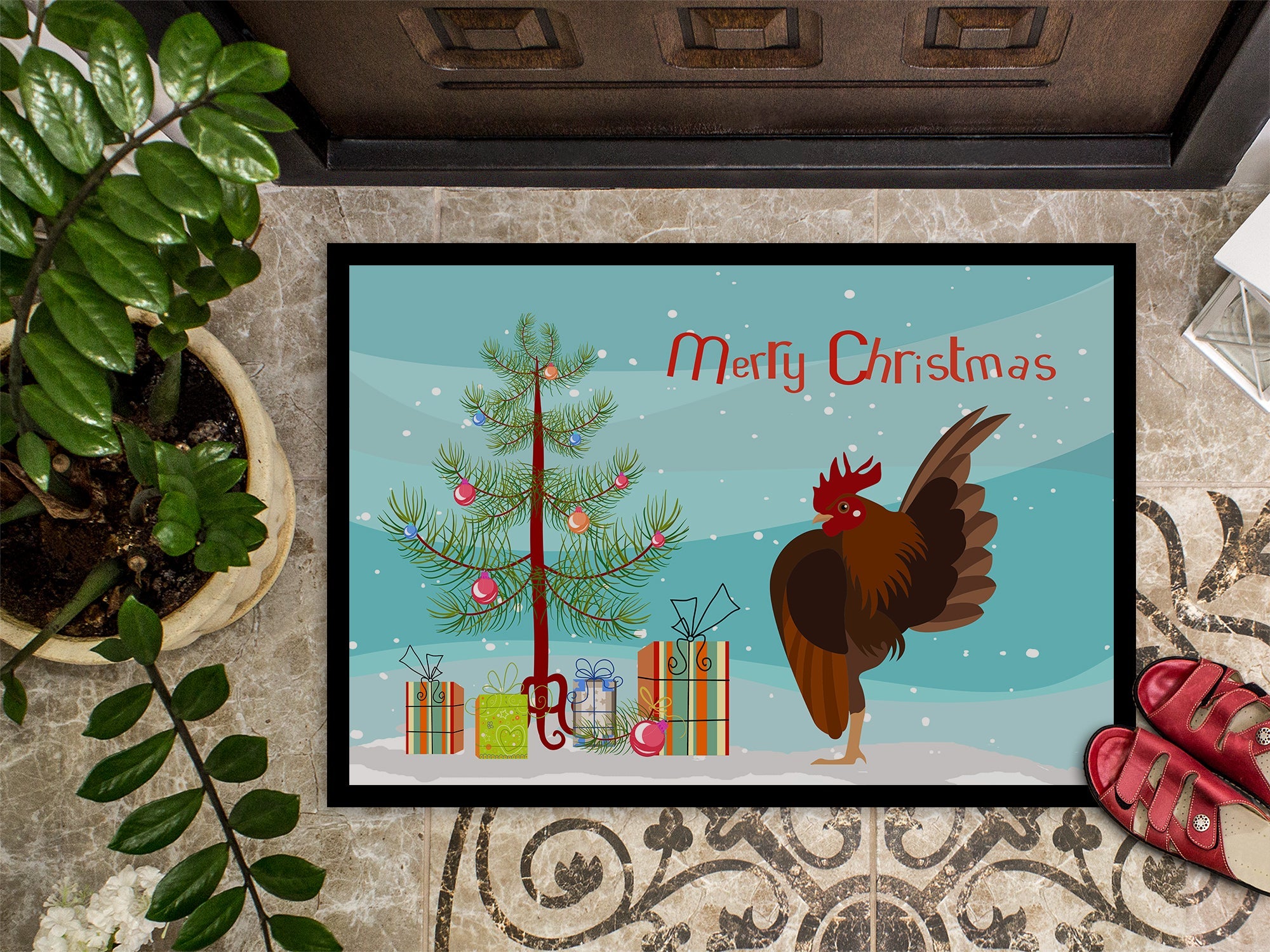 Decorate your space with our Christmas Malaysian Serama Chicken artwork on a Doormat. Welcome your guests in style with our Artwork Door Mat, designed to withstand almost any weather condition. This mat, measuring approximately 18 by 27 inches, is held together by durable black binding tape. Its top layer, composed of polyester felt, is dyed with the eye-catching image you see on the mat. A few layers below provide the mat with stability, while its rubber bottom is stamped to help prevent slipping and ensures safety. Our mat works wonderfully as both an indoor or outdoor door mat. For cleaning, simply hose it off with water or use a power washer - no need for any cleaner that produces suds. Avoid scrubbing with a brush, instead, opt for the vacuum on floor setting. Designed manufactured and printed in the USA, this mat is a perfect addition to your porch, outdoor kitchen, entryway, or any indoor space. Its unique design makes it a charming decorative rug that greets your guests and adds a stylish touch to your home decor.
