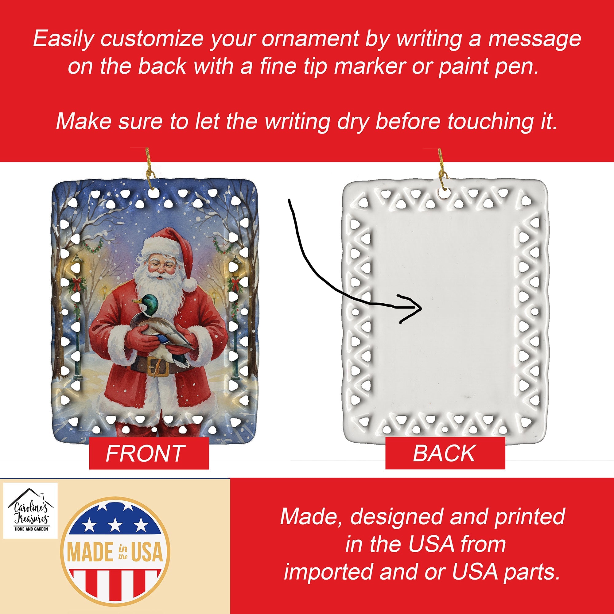 Porcelain Ornament featuring breed specific Mallard artwork. Celebrate Christmas with this Christmas Ornament. Add a unique, personal touch to your holiday decor with our Rectangular Lattice Porcelain Ornament. Perfect for creating cherished memories, this high-quality ornament shines under festive lights, reflecting warmth and joy throughout your Christmas tree. Crafted with a glossy finish, it showcases vibrant, full-color artwork contributed by our talented artists, ensuring your tree is adorned with a burst of color and holiday spirit. What sets this Porcelain Ornament apart is its customizable white back. Use a paint pen or permanent marker to write a heartfelt message, commemorate a special year, or mark an unforgettable date, turning this ornament into a keepsake that will be treasured for years to come. For best results, allow any personalization to dry thoroughly before handling. Each ornament comes complete with a delicate gold cord, making it easy to hang and display. Proudly made in the USA, this ornament measures 3.375 x 2.625 inches and is a thoughtful gift for pet sitters, teachers, family members, or anyone who would appreciate a little extra holiday magic. Bring style, charm, and a touch of personal meaning to your Christmas tree with this beautifully designed ornament..