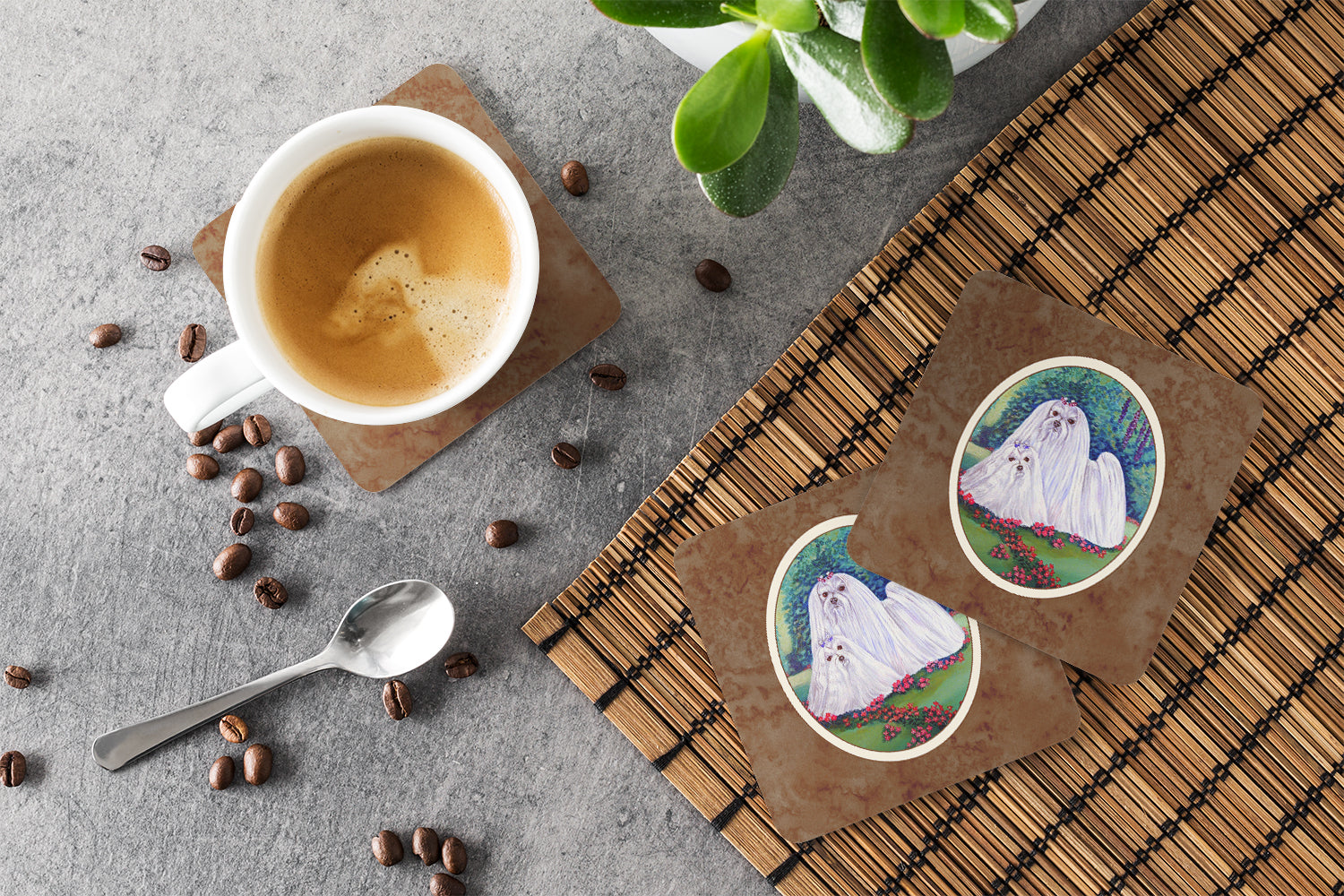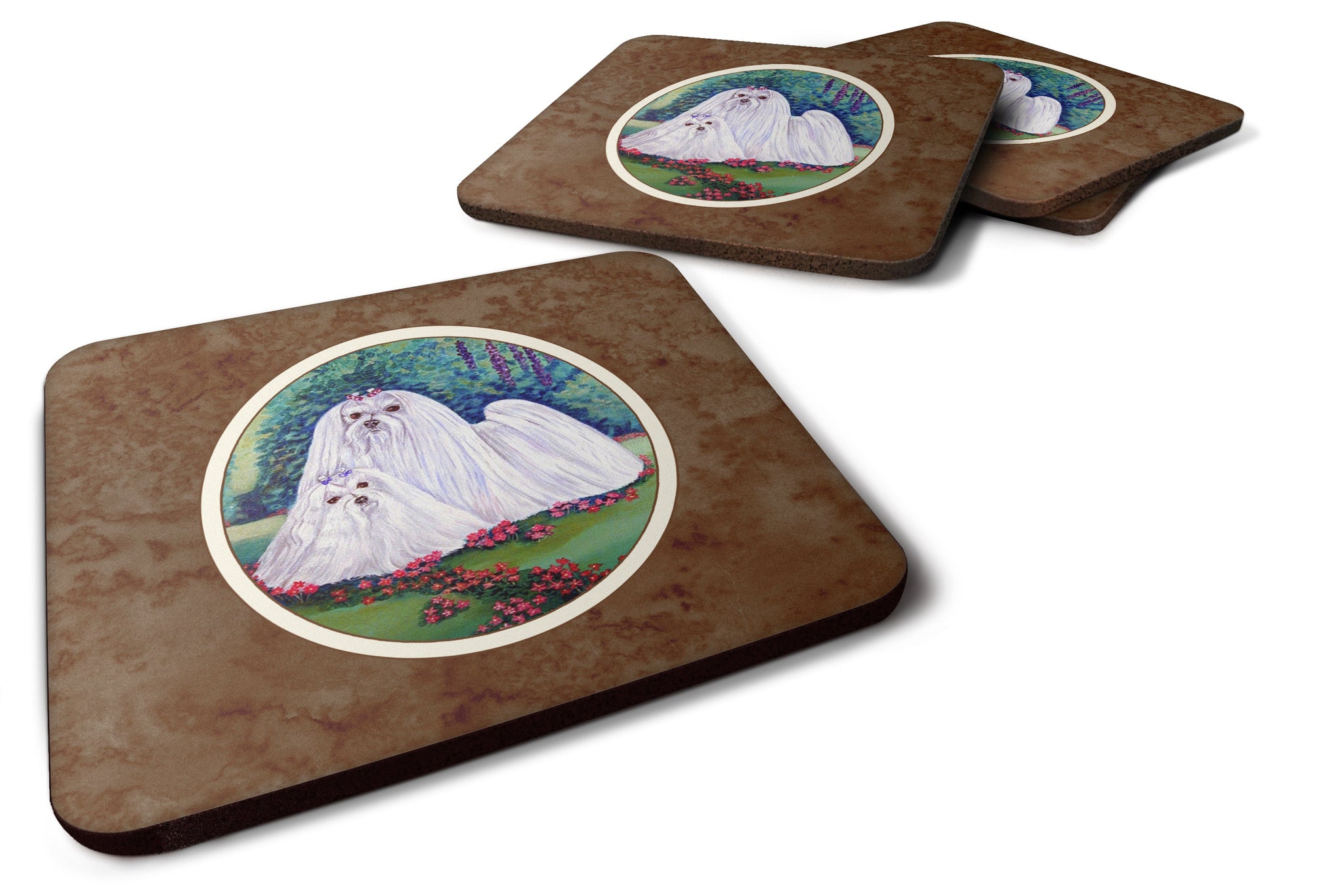 Decorate your space with our Maltese artwork on a Coaster set. Presenting our Set of 4 Foam Coasters, a stylish and practical addition to your table setting. Each square coaster, measuring 3 1/2 inches by 3 1/2 inches, is perfectly sized to accommodate various drinkware, from coffee mugs to tumblers. These coasters stand out with their full-color artwork, permanently dyed onto the material for a vibrant and fade-resistant finish. They're not just functional, they're a fashionable statement, adding a touch of flair to any gathering or event. Our foam coasters serve a dual purpose - they protect your table from water stains and are perfect for both hot and cold drinks. The material used is similar to that of our high-quality mouse pads, ensuring durability and heat resistance. These coasters are easy to maintain - simply wash them in the top of your dishwasher and lay flat to dry. The design won't come off, ensuring they retain their vivid colors for years. Pair them with one of our insulated coolers or huggers for a cohesive, thoughtful gift set. Enhance your beverage experience with our Set of 4 Foam Coasters.