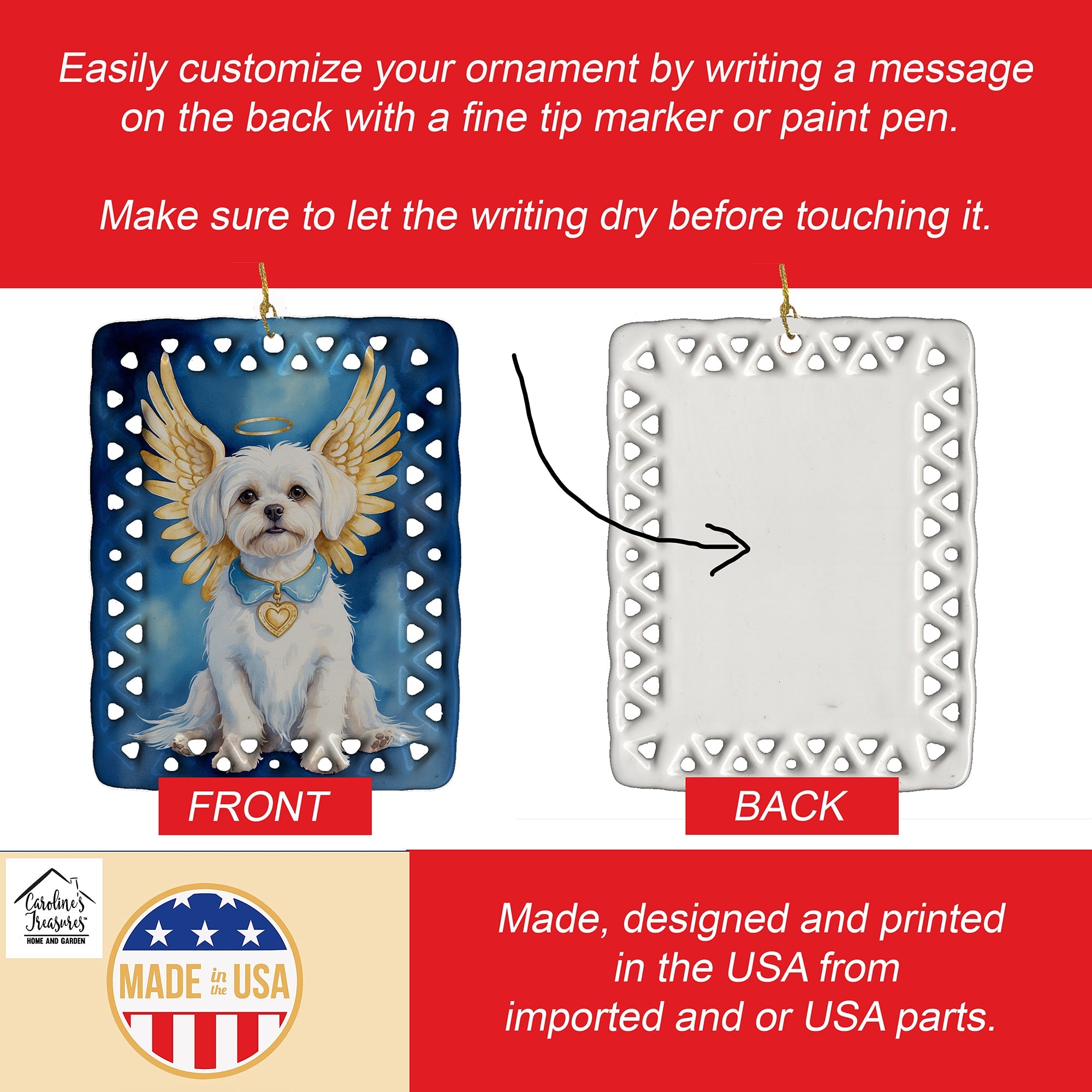 Porcelain Ornament featuring breed specific Maltese artwork. Celebrate Christmas with this Christmas Ornament. Add a unique, personal touch to your holiday decor with our Rectangular Lattice Porcelain Ornament. Perfect for creating cherished memories, this high-quality ornament shines under festive lights, reflecting warmth and joy throughout your Christmas tree. Crafted with a glossy finish, it showcases vibrant, full-color artwork contributed by our talented artists, ensuring your tree is adorned with a burst of color and holiday spirit. What sets this Porcelain Ornament apart is its customizable white back. Use a paint pen or permanent marker to write a heartfelt message, commemorate a special year, or mark an unforgettable date, turning this ornament into a keepsake that will be treasured for years to come. For best results, allow any personalization to dry thoroughly before handling. Each ornament comes complete with a delicate gold cord, making it easy to hang and display. Proudly made in the USA, this ornament measures 3.375 x 2.625 inches and is a thoughtful gift for pet sitters, teachers, family members, or anyone who would appreciate a little extra holiday magic. Bring style, charm, and a touch of personal meaning to your Christmas tree with this beautifully designed ornament..