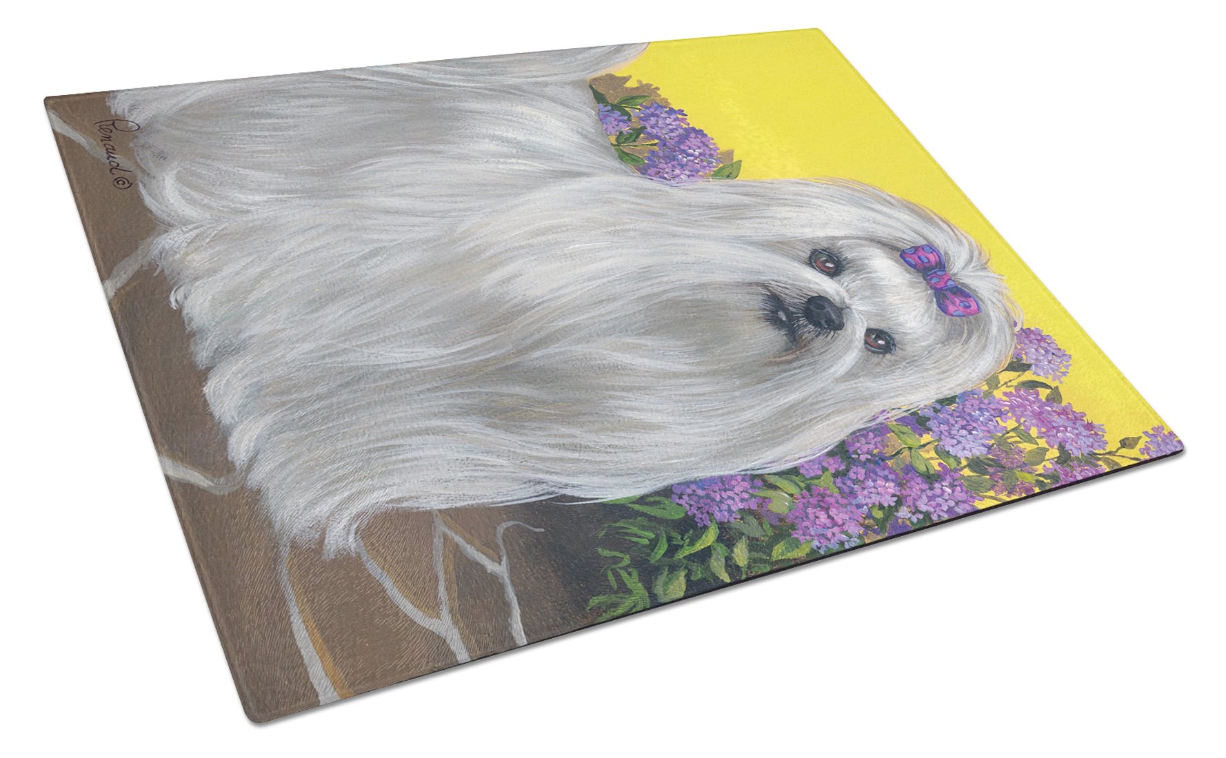 Decorate your space with our Maltese artwork on a Cutting Board. Introduce your kitchen to the vibrant, large Decorative Glass Cutting Board from Caroline's Treasures. Crafted from resilient tempered glass, this board is not only a utilitarian necessity but also a colorful art piece. With its generous dimensions of 15 inches in height and 12 inches in length, it offers ample space for all your cutting needs. Every piece showcases captivating artwork from distinguished artists, bringing an aesthetic edge to your kitchen. Beyond its attractive design, this cutting board ensures your countertop stays pristine and unscathed, owing to its heat-resistant properties. Engineered with user convenience in mind, it features non-skid feet for stability, and rounded corners for additional safety. Its robust construction renders it virtually unbreakable, guaranteeing longevity. The board comes with protective feet bumpers, maintaining its position during use. This product is recommended to be hand washed only. Proudly printed and assembled in the United States, this cutting board exemplifies superior craftsmanship. With Caroline's Treasures' Decorative Glass Cutting Board, you're investing in a blend of functionality and artistic flair.