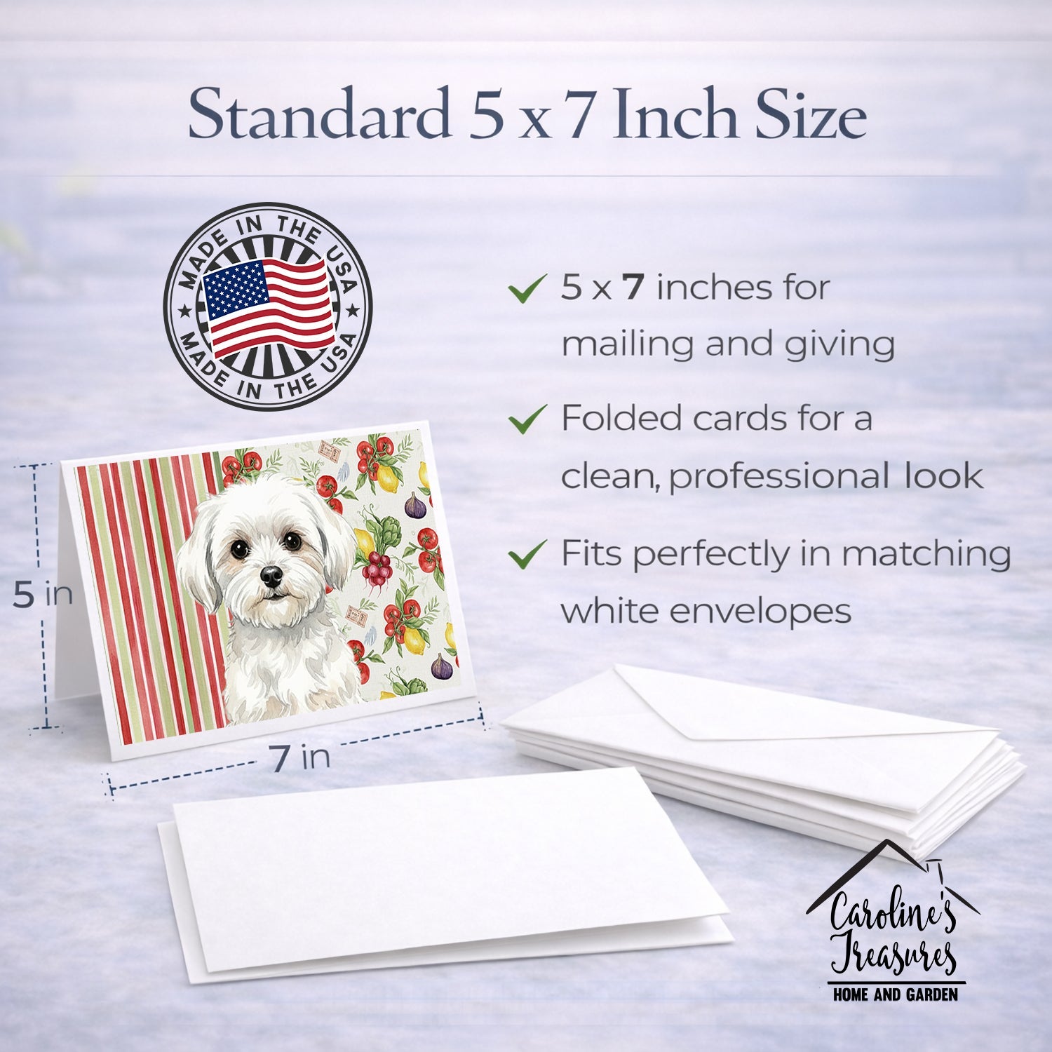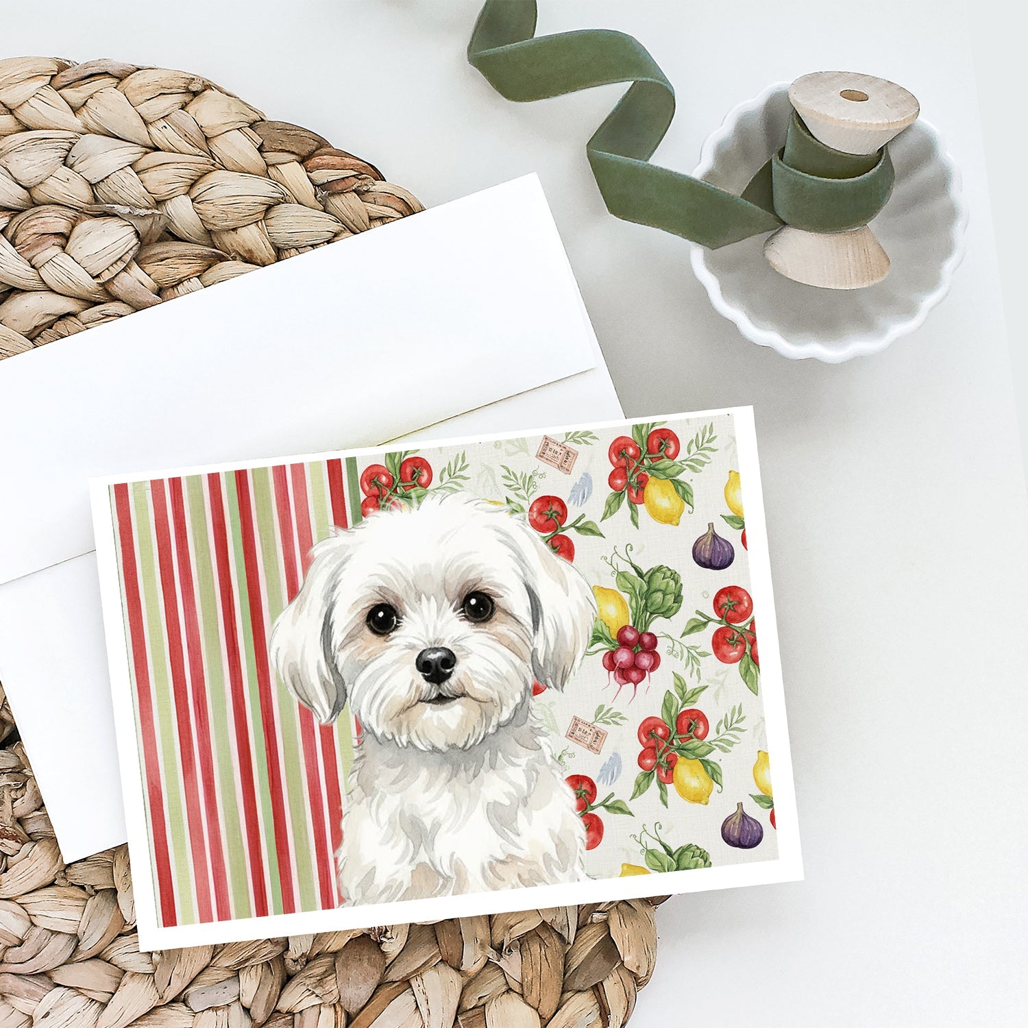 Shown here is the Maltese Vegetables Greeting Cards Pack of 8 from Caroline's Treasures featuring artwork of a Maltese in a Everyday design. The detailed illustration and vibrant colors make it a standout accent that celebrates both seasonal style and love for the subject. This image features a vibrant watercolor vegetable pattern with tomatoes, lemons, artichokes, figs, radishes, and leafy greens arranged in a repeating design, paired with classic red and green stripes. The bright, garden-fresh palette creates a cheerful, farmhouse-inspired look that feels lively, welcoming, and perfect for kitchen décor. Everyday décor celebrates personal style and the small moments that make a house feel like home. Thoughtful designs add warmth and personality that can be enjoyed year-round. Celebrate special moments with Caroline's Treasures Printed Greeting Card Pack. This pack includes eight beautifully folded 5x7 cards, accompanied by eight matching white envelopes. With blank interiors, these cards provide ample space for your personalized messages and heartfelt holiday greetings. Each card features captivating full-color artwork, meticulously printed in our facility on high-quality 80 lb cover stock or 216 GSM. The super smooth finish of the white cards enhances the visual impact of the artwork, creating a truly stunning presentation. Designed by our talented in-house artists or licensed artists, the artwork on these cards showcases their creativity and attention to detail. From vibrant illustrations to captivating designs, each card tells its own unique story. Whether it's for birthdays, anniversaries, holidays, or any special occasion, Caroline's Treasures Greeting Card Pack is the perfect way to convey your heartfelt sentiments. Share joy, love, and warm wishes with these exquisite cards and make every moment unforgettable. Perfect for: Writing personal messages, everyday correspondence, and thoughtful notes, Dogs-themed stationery collections, or year-round use for Maltese lovers. Maltese are small companion dogs known for their gentle temperament and flowing white coats. This affectionate breed is cherished for its loyalty, intelligence, and strong attachment to its owners. Makes a heartfelt gift for: Maltese owners, Dogs lovers, Everyday gifts, pet parents, friends who adore their Maltese, or anyone celebrating Dogs.