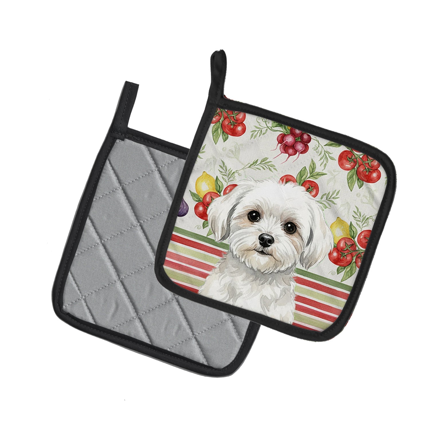 Pair of Pot Holders featuring breed specific Maltese artwork. Add warmth, personality, and function to your kitchen with our Vegetables Pot Holder Pair. Each set includes two quilted hot pads, featuring original full-color watercolor artwork on a soft polyester front accented by black trim. Crafted with multiple layers for performance: Top Layer: Vibrant artwork permanently dyed into polyester fabric. Middle Layer: US-manufactured insulated material with breathable polyester fibers and a reflective metalized film that reflects heat back to its source. Bottom Layer: A silver heat-resistant backing for extra protection. Each pot holder measures 7.5" x 7.5", includes a hanging tab, and is quilted for durability. Use them to protect your hands, countertops, and tabletops — or as decorative trivets for Thanksgiving, Christmas, or everyday meals.