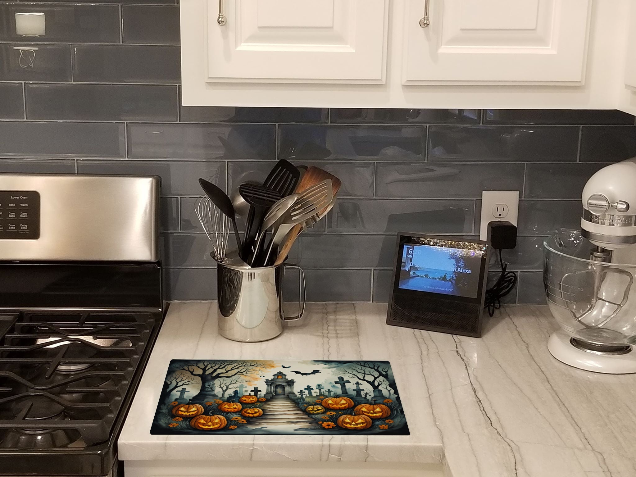 Decorate your space with our Halloween artwork on a Cutting Board. Introduce your kitchen to the vibrant, large Decorative Glass Cutting Board from Caroline's Treasures. Crafted from resilient tempered glass, this board is not only a utilitarian necessity but also a colorful art piece. With its generous dimensions of 15 inches in height and 12 inches in length, it offers ample space for all your cutting needs. Every piece showcases captivating artwork from distinguished artists, bringing an aesthetic edge to your kitchen. Beyond its attractive design, this cutting board ensures your countertop stays pristine and unscathed, owing to its heat-resistant properties. Engineered with user convenience in mind, it features non-skid feet for stability, and rounded corners for additional safety. Its robust construction renders it virtually unbreakable, guaranteeing longevity. The board comes with protective feet bumpers, maintaining its position during use. This product is recommended to be hand washed only. Proudly printed and assembled in the United States, this cutting board exemplifies superior craftsmanship. With Caroline's Treasures' Decorative Glass Cutting Board, you're investing in a blend of functionality and artistic flair.