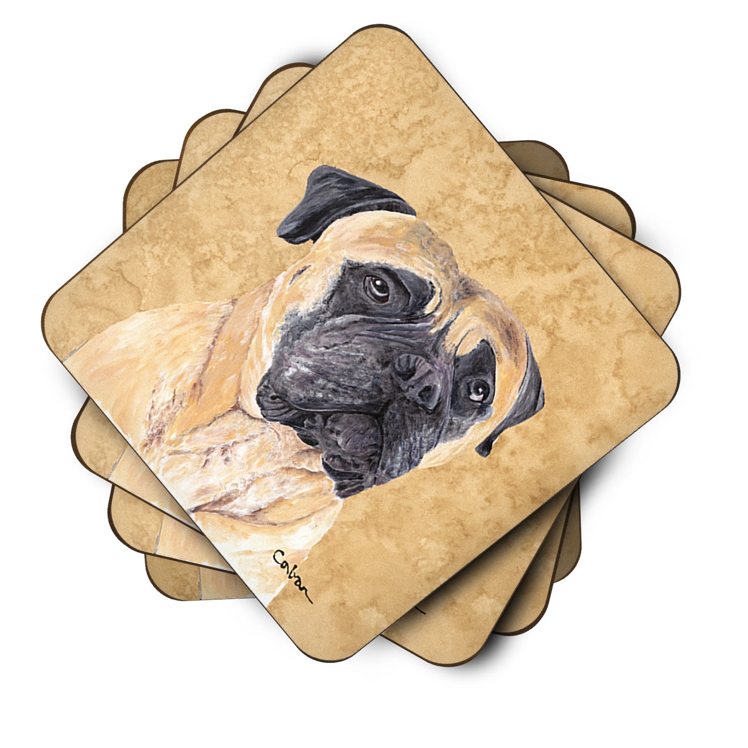 Decorate your space with our Mastiff artwork on a Coaster set. Presenting our Set of 4 Foam Coasters, a stylish and practical addition to your table setting. Each square coaster, measuring 3 1/2 inches by 3 1/2 inches, is perfectly sized to accommodate various drinkware, from coffee mugs to tumblers. These coasters stand out with their full-color artwork, permanently dyed onto the material for a vibrant and fade-resistant finish. They're not just functional, they're a fashionable statement, adding a touch of flair to any gathering or event. Our foam coasters serve a dual purpose - they protect your table from water stains and are perfect for both hot and cold drinks. The material used is similar to that of our high-quality mouse pads, ensuring durability and heat resistance. These coasters are easy to maintain - simply wash them in the top of your dishwasher and lay flat to dry. The design won't come off, ensuring they retain their vivid colors for years. Pair them with one of our insulated coolers or huggers for a cohesive, thoughtful gift set. Enhance your beverage experience with our Set of 4 Foam Coasters.