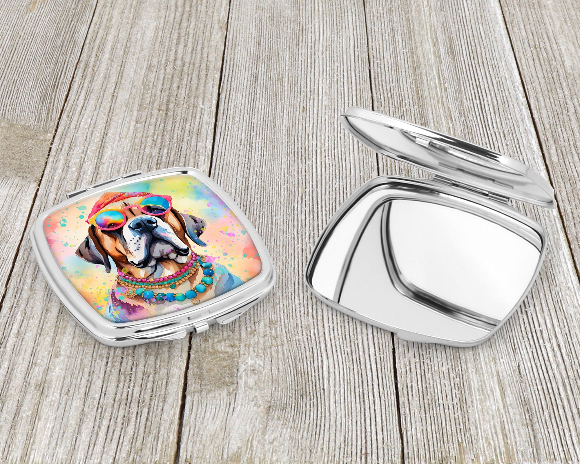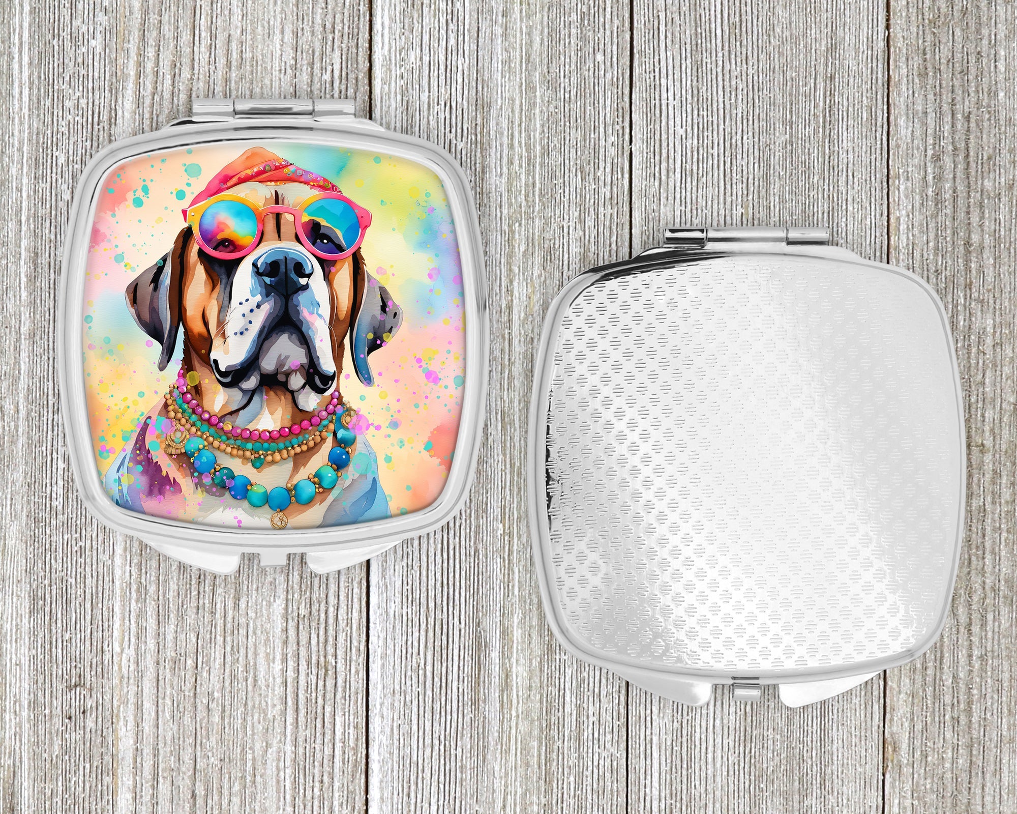 Decorate your space with our Mastiff artwork on a Compact Mirror. Bring a bit of Summer into your home with a Summer Compact Mirror. Introducing our Square Compact Mirror, a blend of elegance, functionality, and compactness, perfect for on-the-go touch-ups. This Silvertone metal mirror, with dimensions of 2.75 inches x 3 inches x .3 inches, fits effortlessly into your purse, handbag, or pocket, ensuring that you can check your appearance anytime, anywhere. Our compact mirror stands out with its eye-catching artwork on the front, adding a dash of style to this practical accessory. It is more than just a mirror; it's a statement piece that reflects your personality and aesthetic. When opened, this compact reveals two mirrors inside, doubling your perspective for precise touch-ups. The Silvertone metal construction ensures durability while maintaining a lightweight feel, making it an ideal everyday carry item. Whether you're rushing to a meeting, prepping for a dinner date, or just need a quick check on your look, our Square Compact Mirror is your reliable companion. Experience the perfect blend of style and practicality with this must-have accessory.