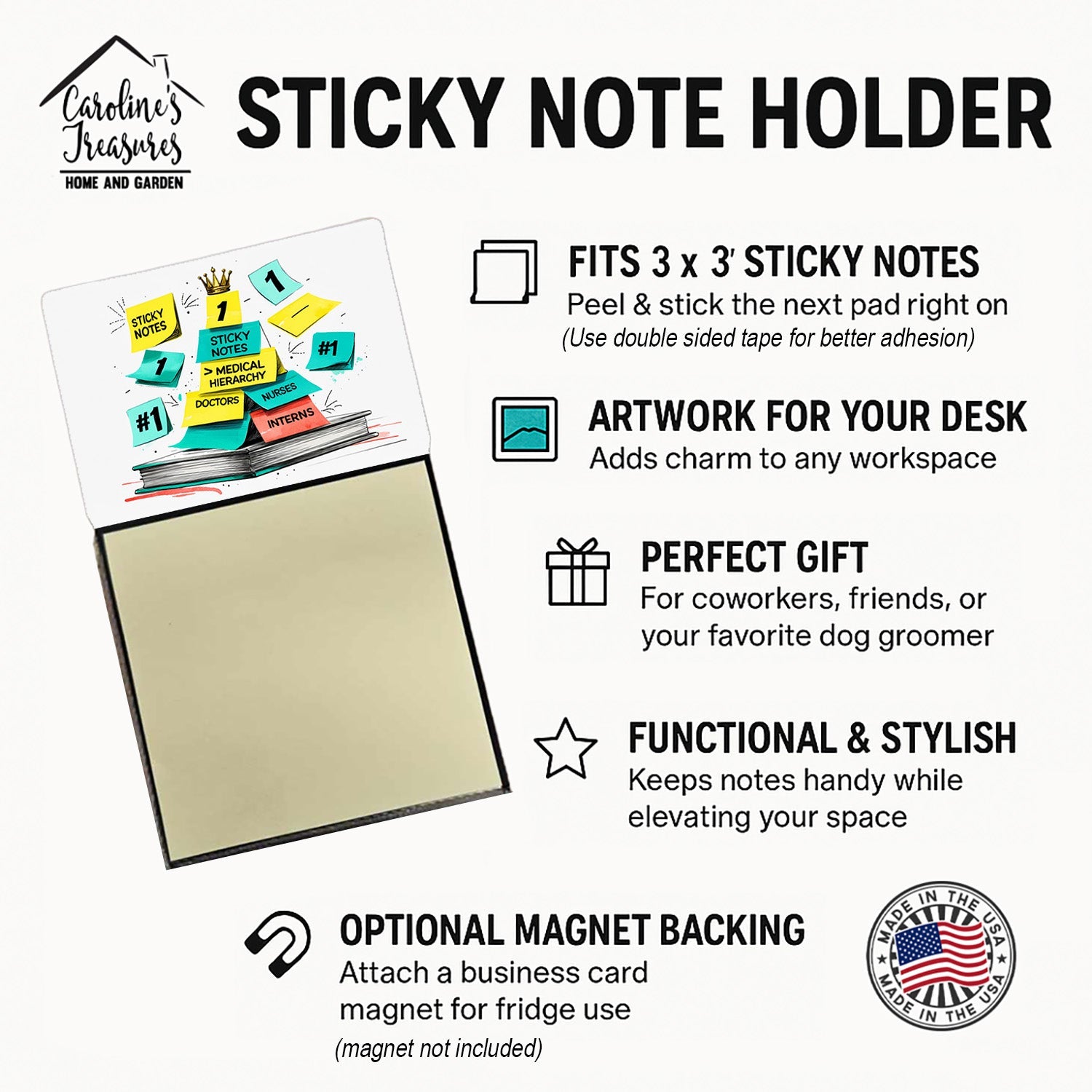 Bring a smile to your shift with this Funny Nurse Sticky Note Holder from Caroline’s Treasures. Featuring the saying - Sticky notes medical hierarchy, it’s the perfect blend of humor and practicality for nurses, nursing students, and healthcare staff. Keep your notes, patient reminders, or grocery lists in one convenient spot while adding a little personality to your workspace. Easy to Refill: Includes a starter pad of 3x3 sticky notes. When it’s time for a new pad, roll a small piece of tape (sticky side out) and place it on the back of the new pad. Press the pad firmly onto the base, and you’re ready to jot notes in seconds. The rigid base keeps your notes secure on any desk or workstation, and you can make it magnetic by adding a business card–sized magnet (sold separately) — perfect for lockers, refrigerators, or rolling carts. An ideal nurse gift for coworkers, nursing grads, nurse practitioners, and physician assistants, this dispenser is both functional and funny — a conversation starter and a stress-buster in the middle of a busy shift. Whether you’re charting, brainstorming, or just trying to remember to buy coffee, this little desk accessory will make you smile every time you use it.