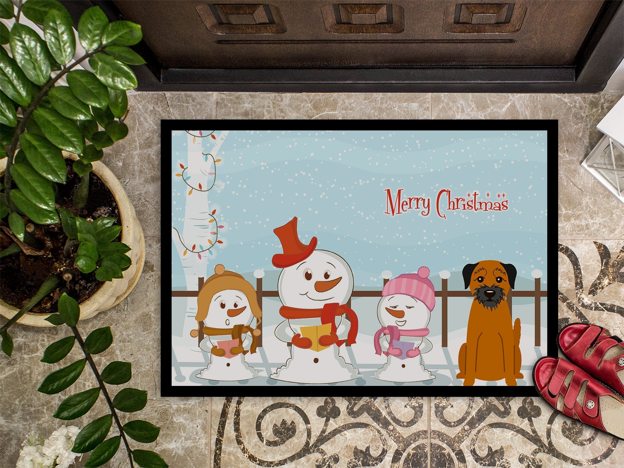 Decorate your space with our Christmas Border Terrier artwork on a Doormat. Welcome your guests in style with our Artwork Door Mat, designed to withstand almost any weather condition. This mat, measuring approximately 24 by 36 inches, is held together by durable black binding tape. Its top layer, composed of polyester felt, is dyed with the eye-catching image you see on the mat. A few layers below provide the mat with stability, while its rubber bottom is stamped to help prevent slipping and ensures safety. Our mat works wonderfully as both an indoor or outdoor door mat. For cleaning, simply hose it off with water or use a power washer - no need for any cleaner that produces suds. Avoid scrubbing with a brush, instead, opt for the vacuum on floor setting. Designed manufactured and printed in the USA, this mat is a perfect addition to your porch, outdoor kitchen, entryway, or any indoor space. Its unique design makes it a charming decorative rug that greets your guests and adds a stylish touch to your home decor.