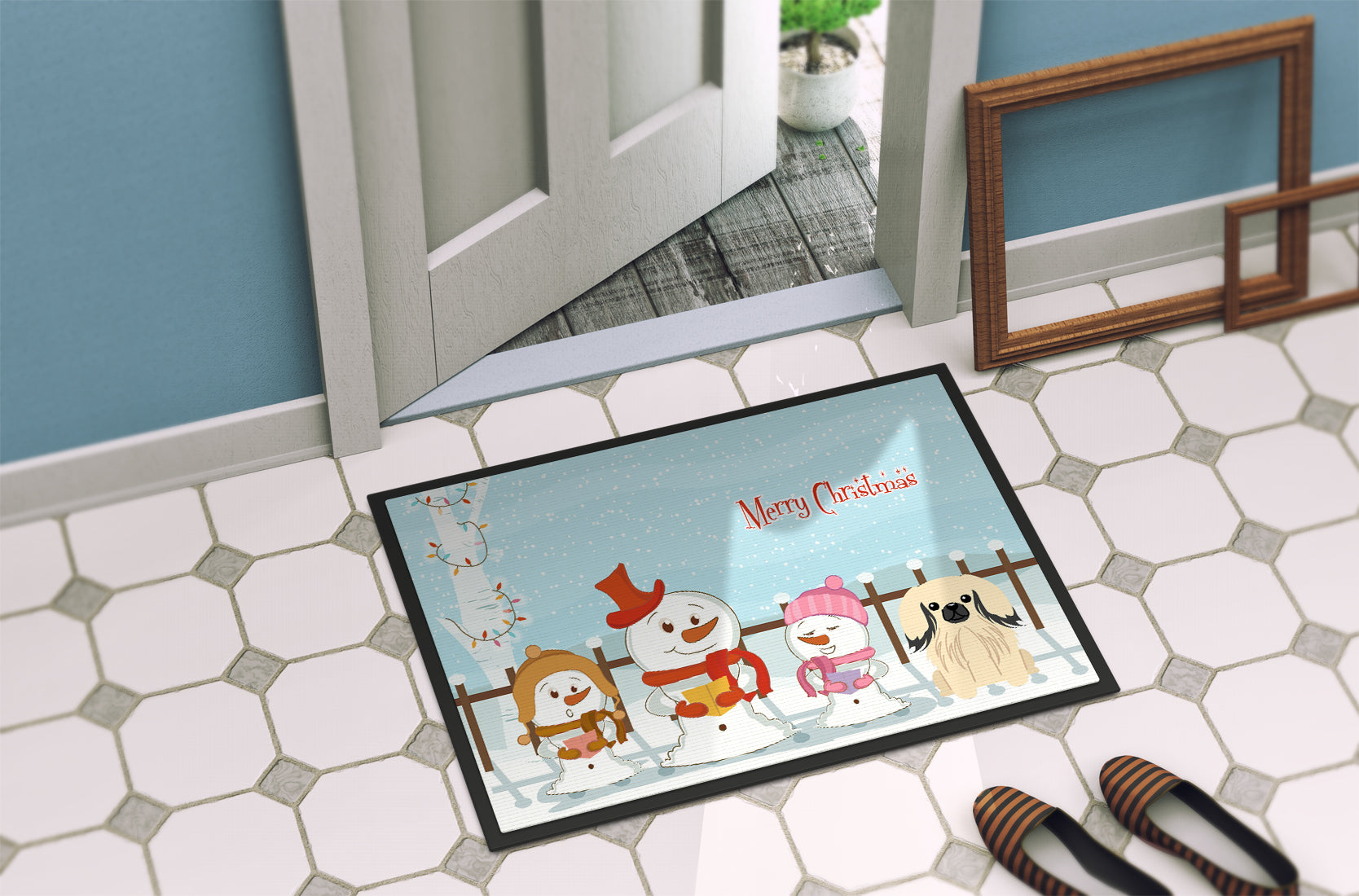 Decorate your space with our Christmas Pekingese artwork on a Doormat. Welcome your guests in style with our Artwork Door Mat, designed to withstand almost any weather condition. This mat, measuring approximately 24 by 36 inches, is held together by durable black binding tape. Its top layer, composed of polyester felt, is dyed with the eye-catching image you see on the mat. A few layers below provide the mat with stability, while its rubber bottom is stamped to help prevent slipping and ensures safety. Our mat works wonderfully as both an indoor or outdoor door mat. For cleaning, simply hose it off with water or use a power washer - no need for any cleaner that produces suds. Avoid scrubbing with a brush, instead, opt for the vacuum on floor setting. Designed manufactured and printed in the USA, this mat is a perfect addition to your porch, outdoor kitchen, entryway, or any indoor space. Its unique design makes it a charming decorative rug that greets your guests and adds a stylish touch to your home decor.