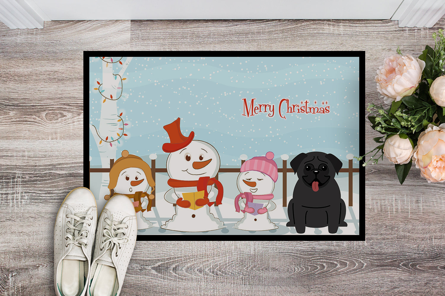 Merry Christmas Carolers Pug Black Doormat - 24x36 Decorative Floor Mat – Indoor/Outdoor Rug with Artistic Flair BB2337JMAT