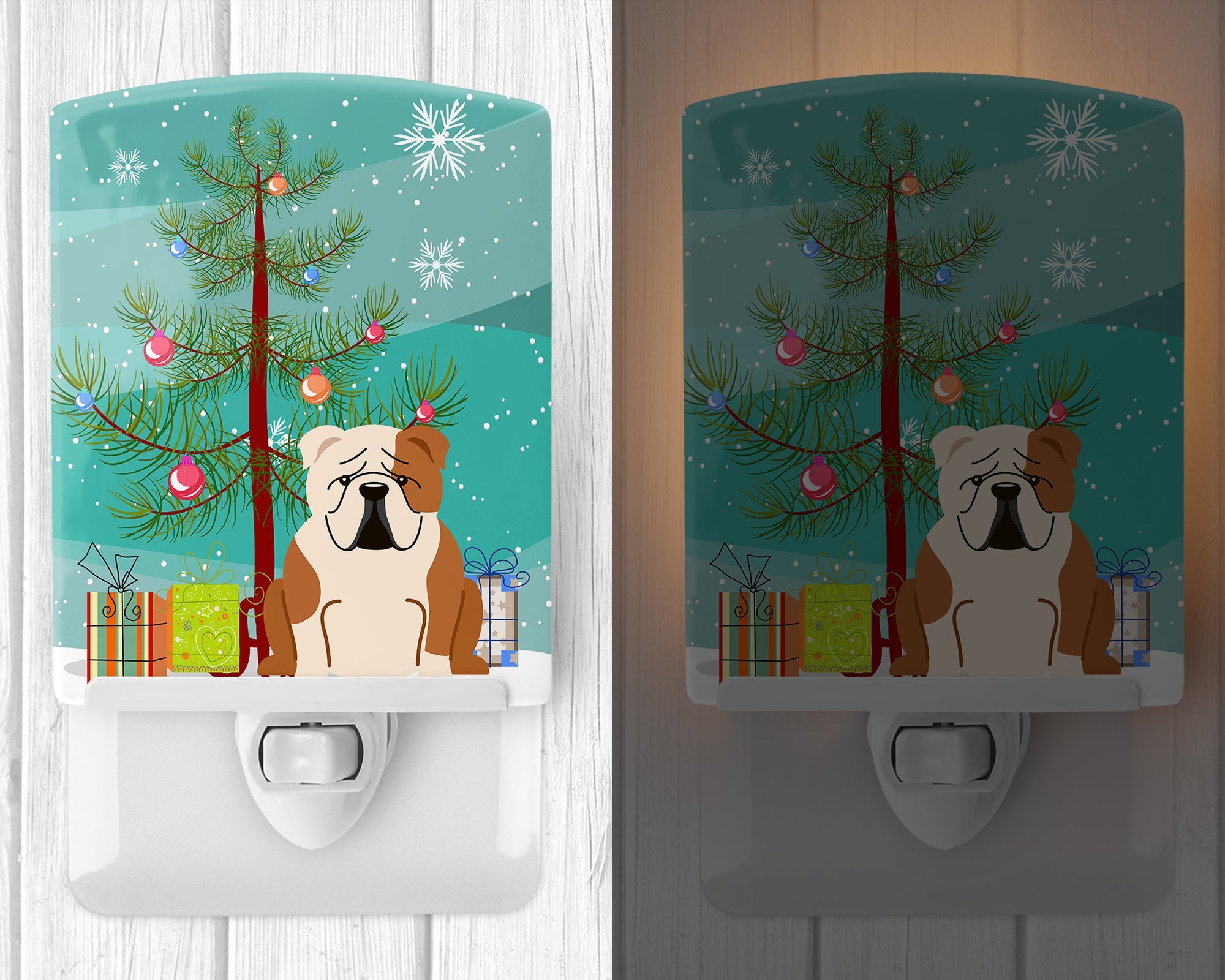 Decorate your space with our Christmas Bulldog, English Bulldog artwork on a Night Light. Introduce a splash of artistic flair and subtle illumination to your space with the Decorative Ceramic Night Light from Caroline's Treasures. Perfect for any room, this night light seamlessly blends functionality with an aesthetic appeal, offering a stylish solution to brighten up dark corners of your home or office. Boasting a six-inch high by four-inch wide ceramic tile at the front, it showcases vivid, full-color artwork from distinguished artists, transforming a simple utility into a vibrant art piece. The artwork is securely encased in a robust metal holder, ensuring durability and longevity. Two screws are provided to firmly affix the tile into the holder. The holder extends three inches deep, housing an included bulb that emits a soft, welcoming glow. This product meets all safety standards, as evidenced by its UL approval. Proudly made in the United States from imported components, this Decorative Ceramic Night Light is not just a functional device; it's a statement piece that enhances the ambiance of your surroundings.