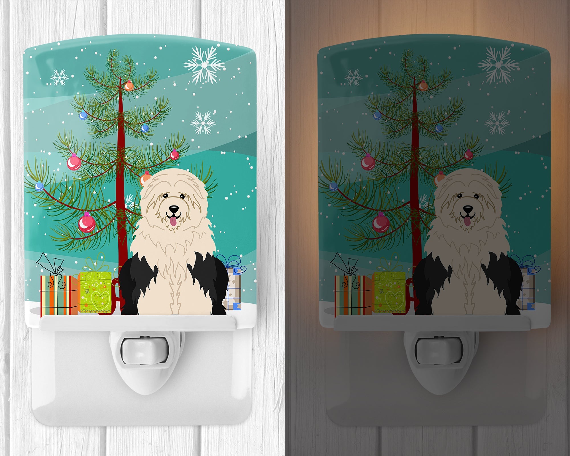Decorate your space with our Christmas Old English Sheepdog artwork on a Night Light. Introduce a splash of artistic flair and subtle illumination to your space with the Decorative Ceramic Night Light from Caroline's Treasures. Perfect for any room, this night light seamlessly blends functionality with an aesthetic appeal, offering a stylish solution to brighten up dark corners of your home or office. Boasting a six-inch high by four-inch wide ceramic tile at the front, it showcases vivid, full-color artwork from distinguished artists, transforming a simple utility into a vibrant art piece. The artwork is securely encased in a robust metal holder, ensuring durability and longevity. Two screws are provided to firmly affix the tile into the holder. The holder extends three inches deep, housing an included bulb that emits a soft, welcoming glow. This product meets all safety standards, as evidenced by its UL approval. Proudly made in the United States from imported components, this Decorative Ceramic Night Light is not just a functional device; it's a statement piece that enhances the ambiance of your surroundings.