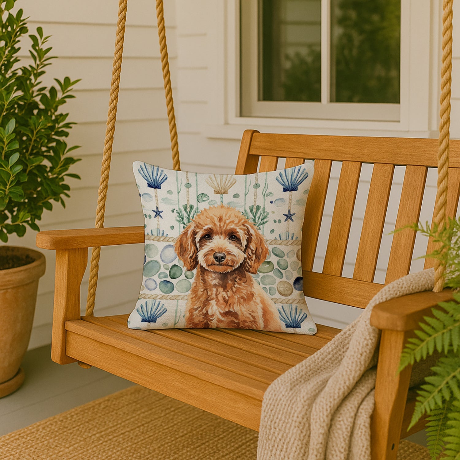 Miniature Apricot Poodle Coastal Sea Glass Throw Pillow
