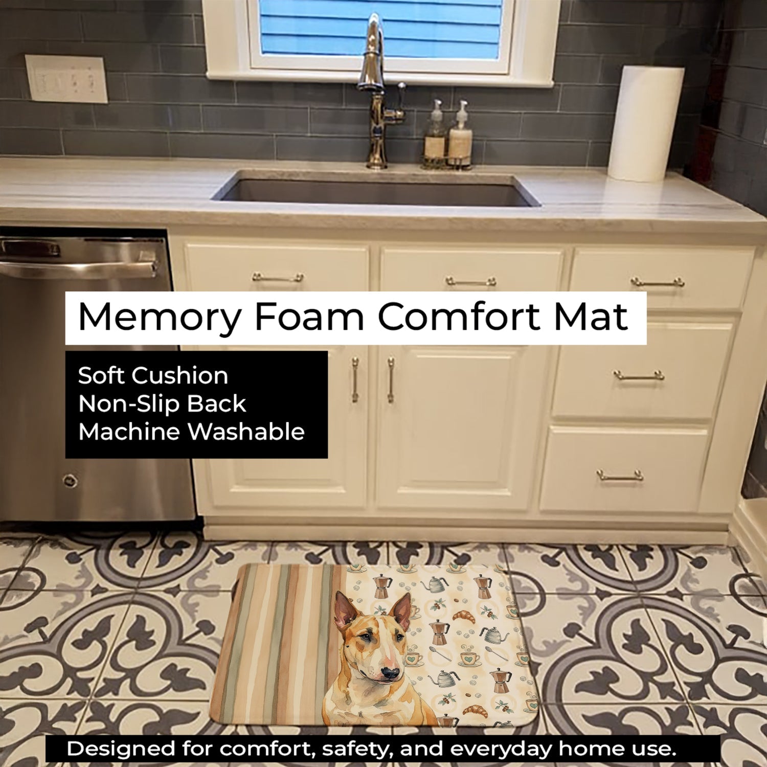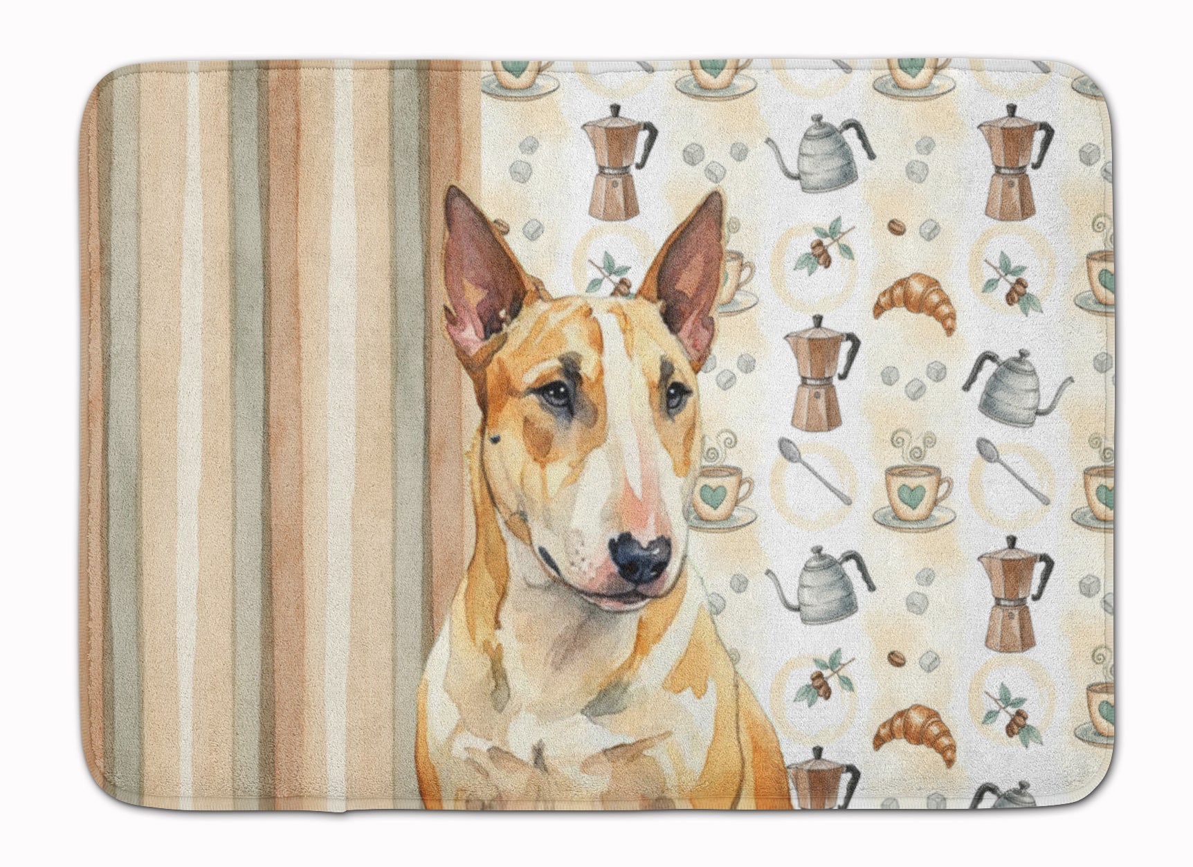 Shown here is the Miniature Bull Terrier Coffee Bar Memory Foam Kitchen Mat from Caroline's Treasures featuring artwork of a Miniature Bull Terrier in a Everyday design. The detailed illustration and vibrant colors make it a standout accent that celebrates both seasonal style and love for the subject. This image features a cozy watercolor coffee-themed pattern with illustrated mugs, moka pots, kettles, croissants, coffee beans, and sugar cubes arranged in a repeating design. Soft neutral tones with warm browns, creams, and subtle sage accents create an inviting, café-inspired look that feels comforting and relaxed. Everyday décor celebrates personal style and the small moments that make a house feel like home. Thoughtful designs add warmth and personality that can be enjoyed year-round. Transform your floor into a work of art with Caroline's Treasures' Memory Foam Mat. This mat offers not only a stunning visual appeal but also a luxurious, plush feel that's incredibly comfortable to the touch. It's a versatile, machine-washable mat designed for both bath and kitchen use, ensuring you experience the best in comfort and convenience. Care Instructions: Maintaining this memory foam mat is a breeze. Simply follow the care instructions on the product tag. It's recommended to wash in cold water and dry on a low-temperature setting in the dryer. This ensures the mat retains its quality and longevity, allowing you to enjoy its beauty and comfort for a long time. Caroline's Treasures' Memory Foam Mat Machine Washable is the perfect blend of artistry, comfort, and practicality, making it a standout addition to any space. Upgrade your home decor with this versatile and stylish mat today. Miniature Bull Terriers feature muscular builds and distinctive head shapes. Their appearance feels bold and confident. Makes a heartfelt gift for: Miniature Bull Terrier owners, Dogs lovers, Everyday gifts, pet parents, friends who adore their Miniature Bull Terrier, or anyone celebrating Dogs.