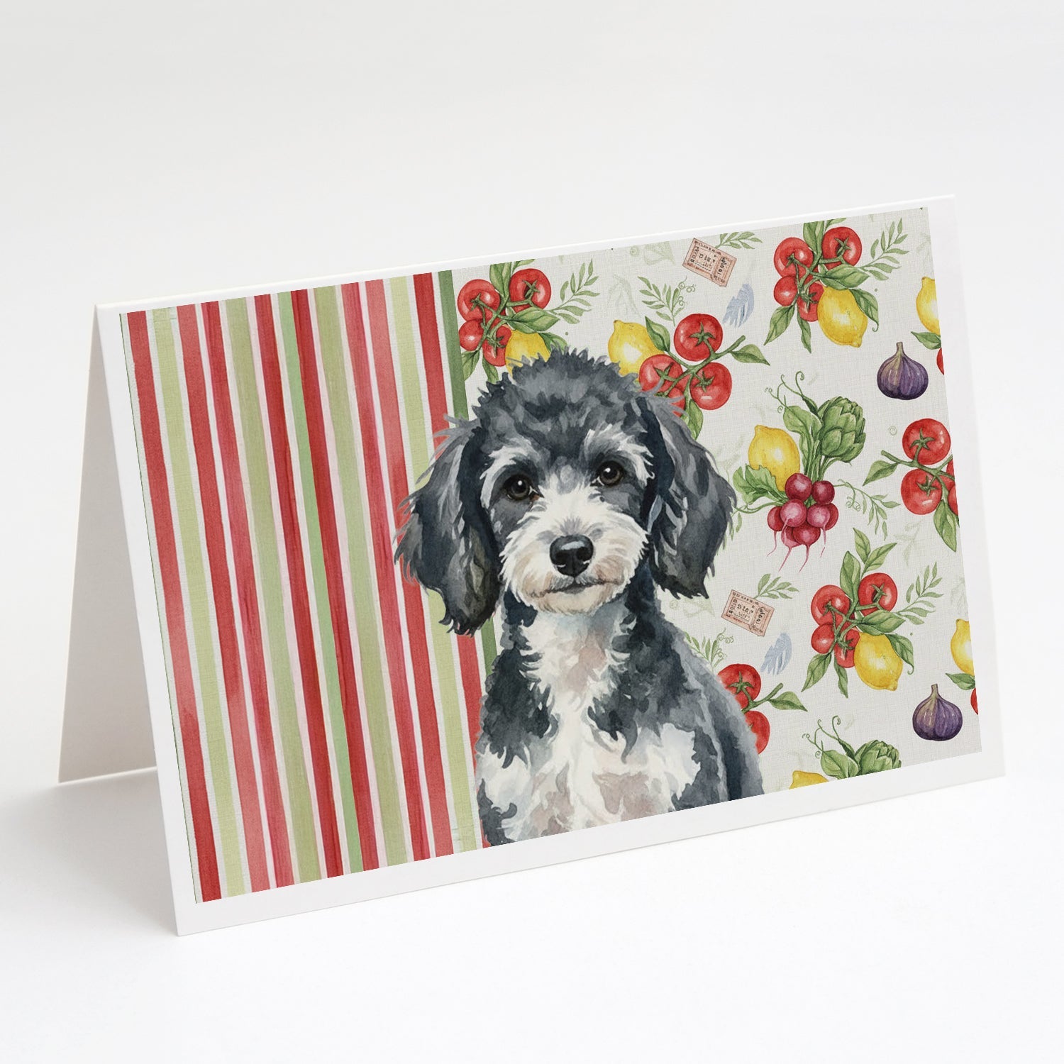 Shown here is the Miniature Parti Poodle Vegetables Greeting Cards Pack of 8 from Caroline's Treasures featuring artwork of a Poodle in a Everyday design. The detailed illustration and vibrant colors make it a standout accent that celebrates both seasonal style and love for the subject. This image features a vibrant watercolor vegetable pattern with tomatoes, lemons, artichokes, figs, radishes, and leafy greens arranged in a repeating design, paired with classic red and green stripes. The bright, garden-fresh palette creates a cheerful, farmhouse-inspired look that feels lively, welcoming, and perfect for kitchen décor. Everyday décor celebrates personal style and the small moments that make a house feel like home. Thoughtful designs add warmth and personality that can be enjoyed year-round. Celebrate special moments with Caroline's Treasures Printed Greeting Card Pack. This pack includes eight beautifully folded 5x7 cards, accompanied by eight matching white envelopes. With blank interiors, these cards provide ample space for your personalized messages and heartfelt holiday greetings. Each card features captivating full-color artwork, meticulously printed in our facility on high-quality 80 lb cover stock or 216 GSM. The super smooth finish of the white cards enhances the visual impact of the artwork, creating a truly stunning presentation. Designed by our talented in-house artists or licensed artists, the artwork on these cards showcases their creativity and attention to detail. From vibrant illustrations to captivating designs, each card tells its own unique story. Whether it's for birthdays, anniversaries, holidays, or any special occasion, Caroline's Treasures Greeting Card Pack is the perfect way to convey your heartfelt sentiments. Share joy, love, and warm wishes with these exquisite cards and make every moment unforgettable. Perfect for: Writing personal messages, everyday correspondence, and thoughtful notes, Dogs-themed stationery collections, or year-round use for Poodle lovers. Poodles are highly intelligent dogs known for their elegance and versatility. Available in standard, miniature, and toy sizes, this breed is admired for its trainability and loyalty. Makes a heartfelt gift for: Poodle owners, Dogs lovers, Everyday gifts, pet parents, friends who adore their Poodle, or anyone celebrating Dogs.