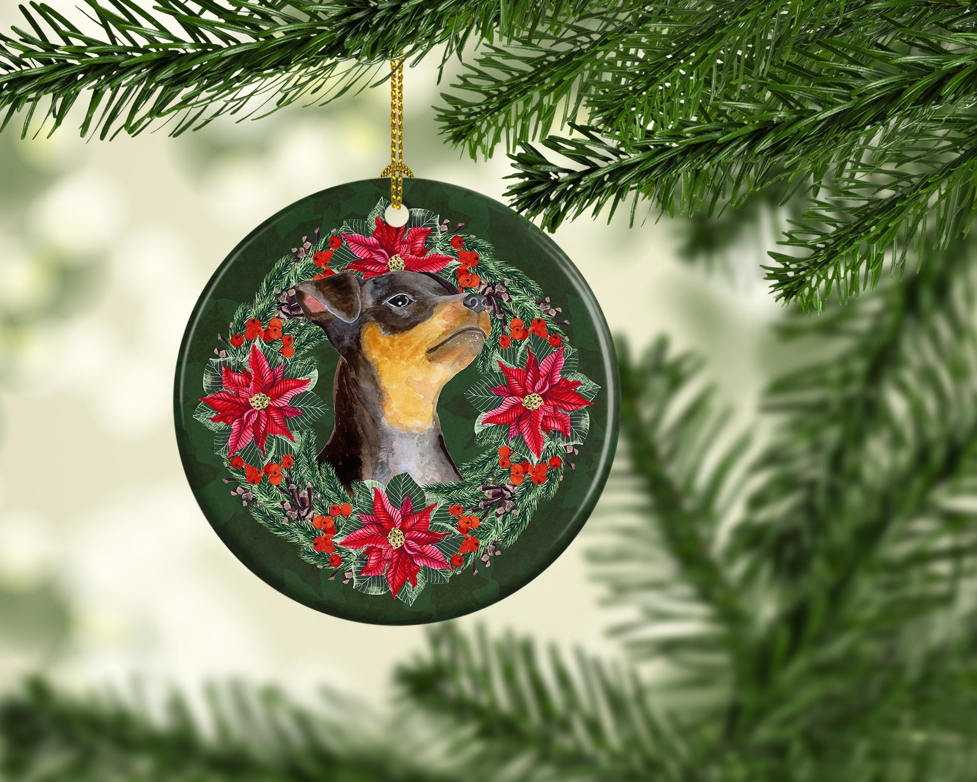 Decorate your space with our Christmas Miniature Pinscher artwork on a Ornament. Add a touch of personalized charm to your Christmas tree this holiday season with our Ceramic Ornament. Measuring 2.8125 inches in diameter, this round porcelain ornament beautifully reflects your festive lights, enhancing your holiday decor. The gloss surface sets off the vibrant, full-color artwork contributed by one of our talented artists, bringing a pop of color and joy to your tree. This Ceramic Ornament doesn't stop at being merely decorative. The white back is designed for personalization. Write a heartfelt message, mark a special year, or inscribe a date with a paint pen or a permanent marker to create a treasured memento. Please ensure you allow any personalization to dry thoroughly before handling to maintain the pristine finish. Included with the ornament is a delicate gold cord for easy hanging. Made in the USA, this Ceramic Ornament makes an exceptional gift for a pet sitter, teacher, family member, or anyone you wish to share a little Christmas magic with. With its blend of style, charm, and personal touch, it's a meaningful addition to any Christmas tree.