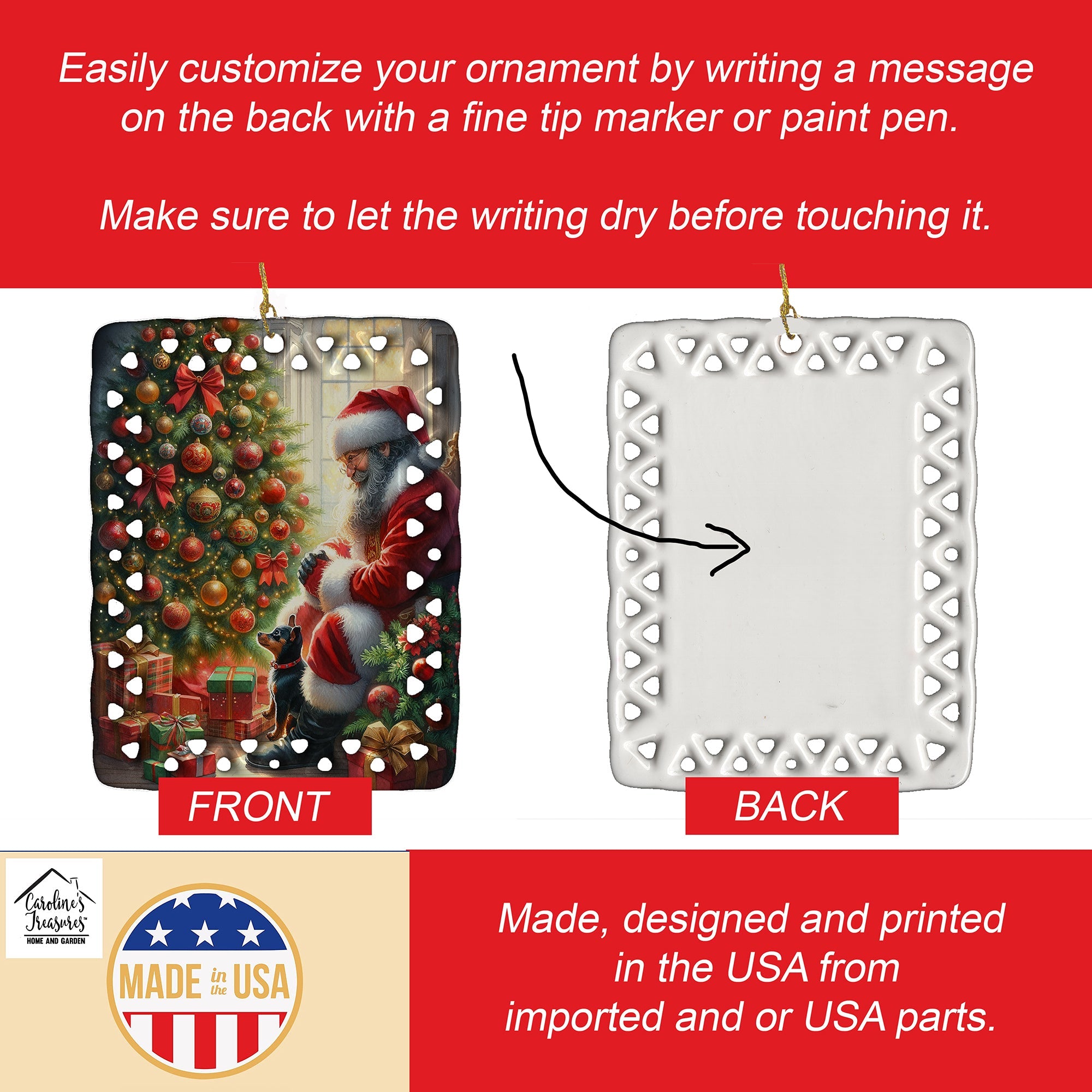 Porcelain Ornament featuring breed specific Miniature Pinscher artwork. Celebrate Christmas with this Christmas Ornament. Add a unique, personal touch to your holiday decor with our Rectangular Lattice Porcelain Ornament. Perfect for creating cherished memories, this high-quality ornament shines under festive lights, reflecting warmth and joy throughout your Christmas tree. Crafted with a glossy finish, it showcases vibrant, full-color artwork contributed by our talented artists, ensuring your tree is adorned with a burst of color and holiday spirit. What sets this Porcelain Ornament apart is its customizable white back. Use a paint pen or permanent marker to write a heartfelt message, commemorate a special year, or mark an unforgettable date, turning this ornament into a keepsake that will be treasured for years to come. For best results, allow any personalization to dry thoroughly before handling. Each ornament comes complete with a delicate gold cord, making it easy to hang and display. Proudly made in the USA, this ornament measures 3.375 x 2.625 inches and is a thoughtful gift for pet sitters, teachers, family members, or anyone who would appreciate a little extra holiday magic. Bring style, charm, and a touch of personal meaning to your Christmas tree with this beautifully designed ornament..