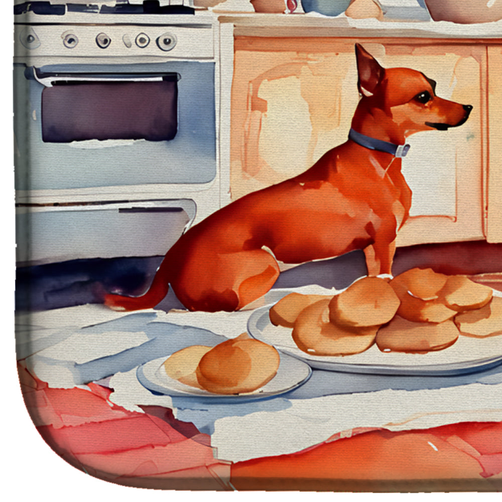 Dish Drying Mat featuring breed specific Miniature Pinscher artwork. Celebrate Christmas with this Christmas Dish Drying Mat. Say goodbye to messy countertops and soggy dish towels with our innovative dish drying mat. Our high-quality dish drying pad is designed to keep your countertops dry while offering a stylish and efficient solution. Whether you're air drying dishes, glasses, stemware, silverware, pots, pans, bottles, or even fruits and vegetables, our dish mat is the perfect choice. The 14 inches x 22 inches size fits most counters and dish drying racks, and the non-slip design ensures stability. Made with water-absorbent polyester and a polyurethane foam insert, our dish drying mat is not only functional but also durable. It's machine washable and printed in the USA for long-lasting use. The beautiful artwork adds flair to your kitchen decor, making it a perfect housewarming gift or present for any occasion. Upgrade your kitchen experience with our absorbent and versatile dish drying mat.