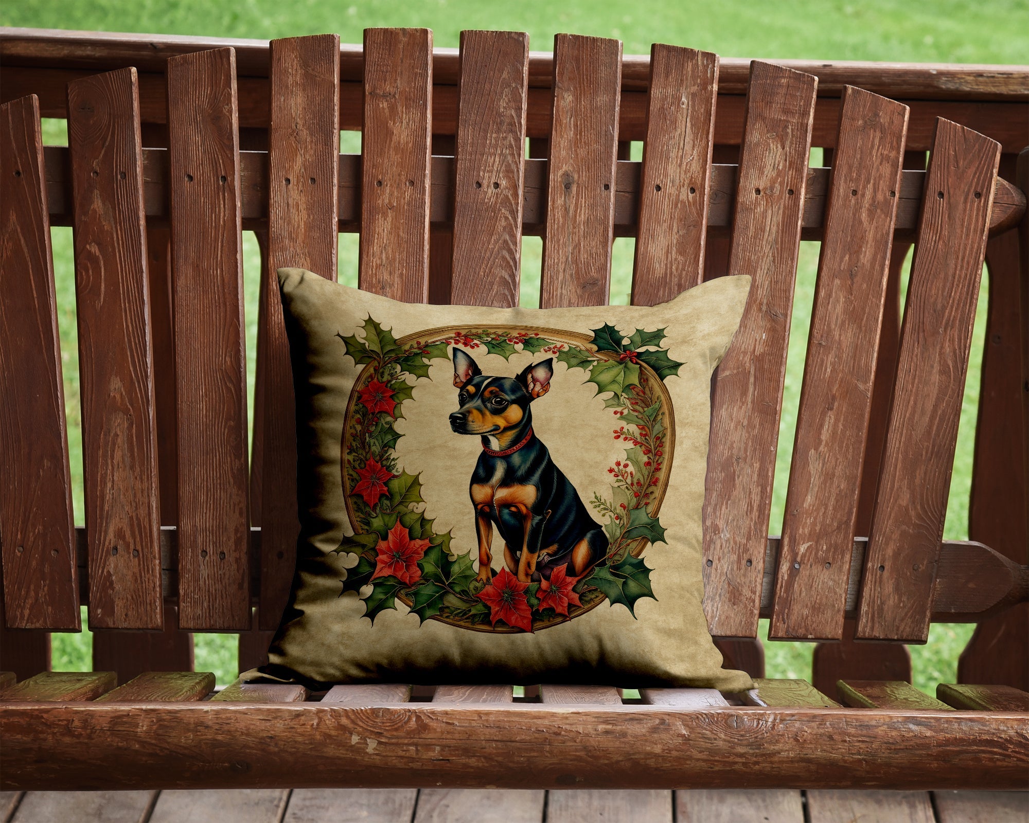 Decorate your space with our Christmas Miniature Pinscher artwork on a Pillow. Bring a bit of Winter into your home with a Winter Pillow. Add a touch of vibrancy and comfort to your outdoor seating with Caroline's Treasures Fabric Decorative Pillow. Measuring approximately 14 inches by 14 inches, this outdoor pillow is crafted to elevate the appeal of your patio furniture, infusing it with vivid color and artistic flair. The pillow includes a 100% Polyester Fabric sham filled with a quality pillow form to provide superior comfort. Innovatively made from our brand new material, specifically woven for its water resistance, this pillow is designed for durability. The soft canvas fabric offers versatility in use, fit for your indoor couch or your outdoor patio, porch, or veranda. The fabric is dyed with colorfast dyes built for resilience against weather conditions, ensuring the pillow retains its beauty over time. Constructed by sewing three fabric pieces to create a sham, the polyester insert is then nestled inside to form the pillow, resulting in an overstuffed pillow that maintains its shape. Both the sham and the pillow insert are proudly made in the United States. As the pillows are handcrafted, there may be minor variations in size, further enhancing their unique charm. Experience comfort in style with Caroline's Treasures Fabric Decorative Pillow.